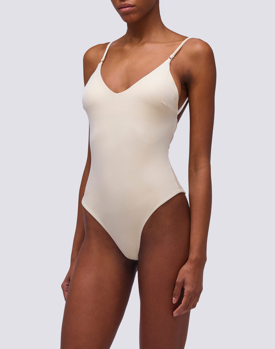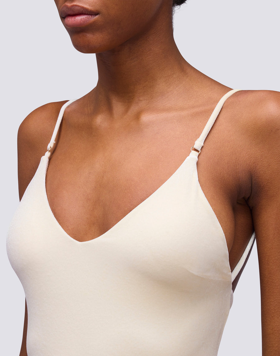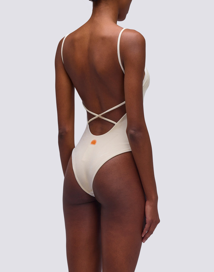 Costume intero da donna in tessuto effetto velluto con lacci posteriori incrociati. Vestibilità regular. Ideale per chi non vuole passare inosservata in spiaggia o carino da usare anche come top, insieme a una mini gonna o a degli shorts.