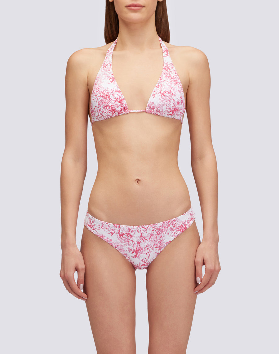 Se cerchi un bikini dallo stile romantico e raffinato, il triangolo americano Hila è l'ideale, grazie alla delicata stampa Fleur de Joie e alle linee morbide. I lacci regolabili e l'imbottitura removibile lo rendono adatto a tutte le fisicità. Da abbinare allo slip in coordinato, venduto separatamente.