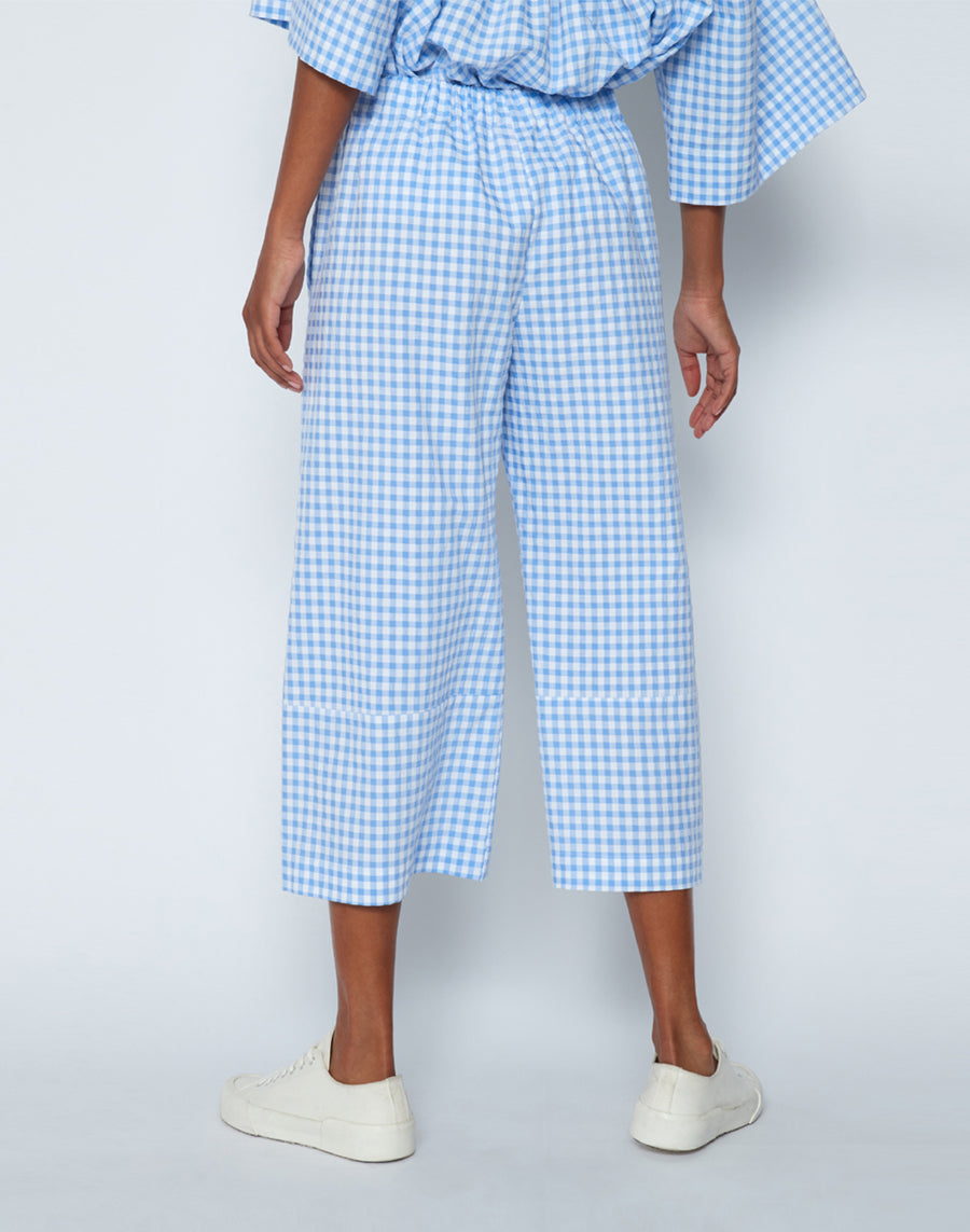 Vestibilità ampia, vita alta, taglio cropped e stampa check per questo pantalone facile da abbinare, da indossare tutta l'estate, perfetto con sneakers e sandali.