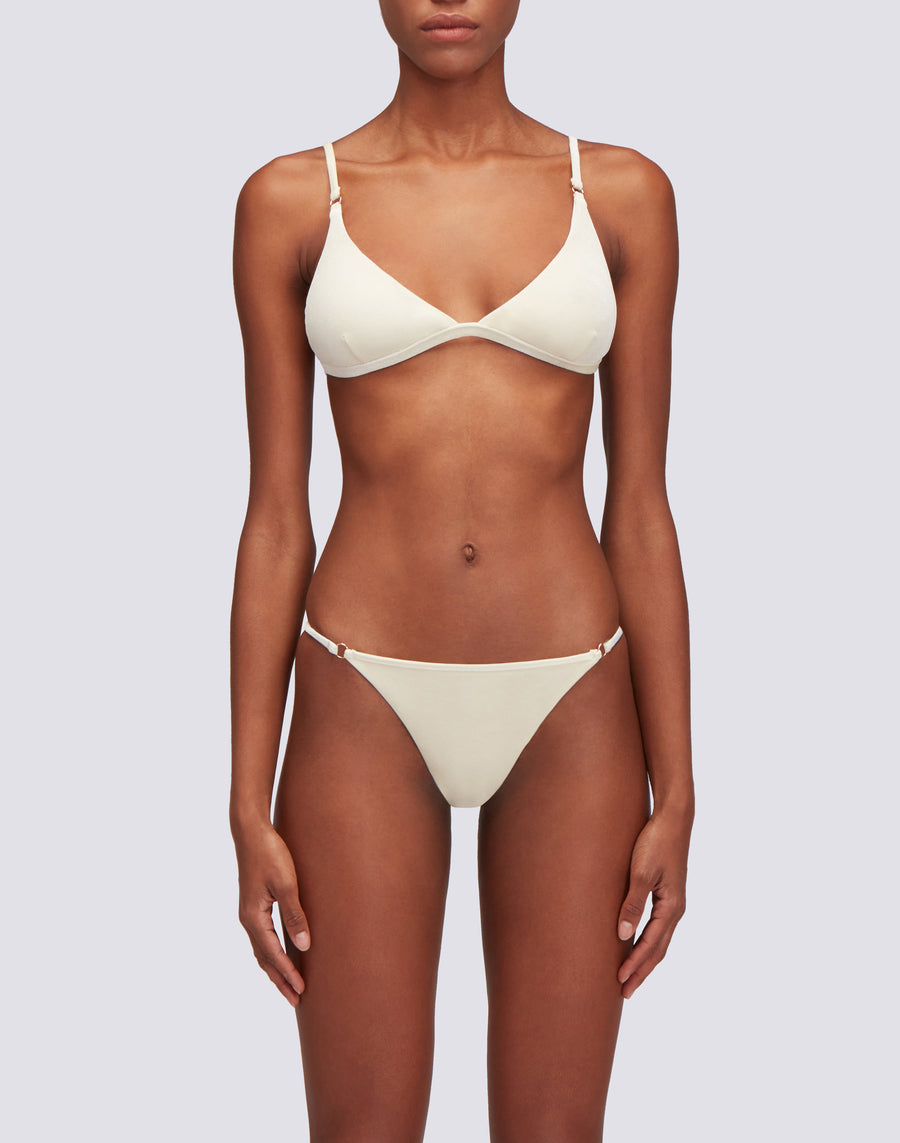 Slip Kerr effetto velluto con lacci laterali fissi e decorazioni metalliche dorate. Elegante e luminoso, per farti brillare in spiaggia.