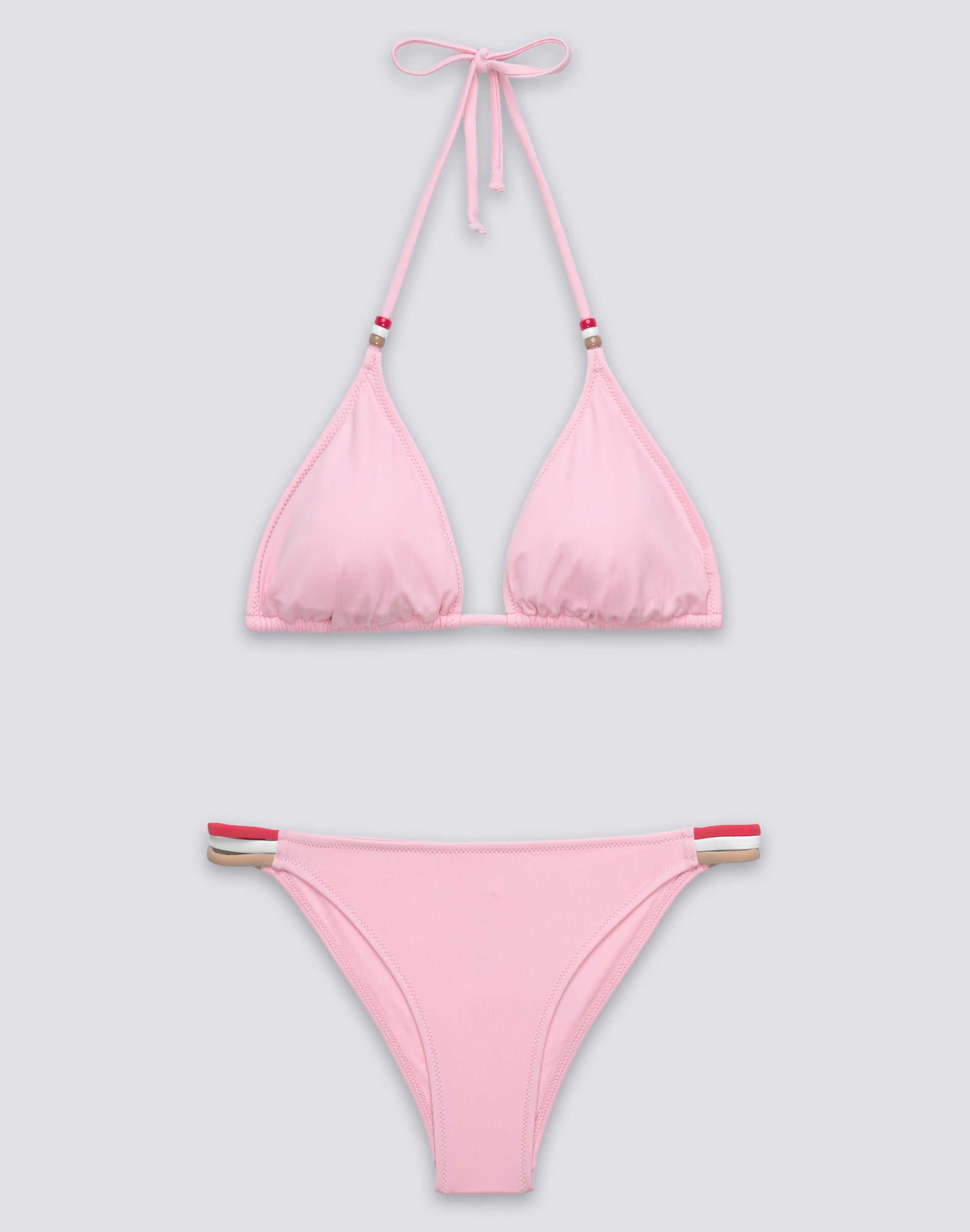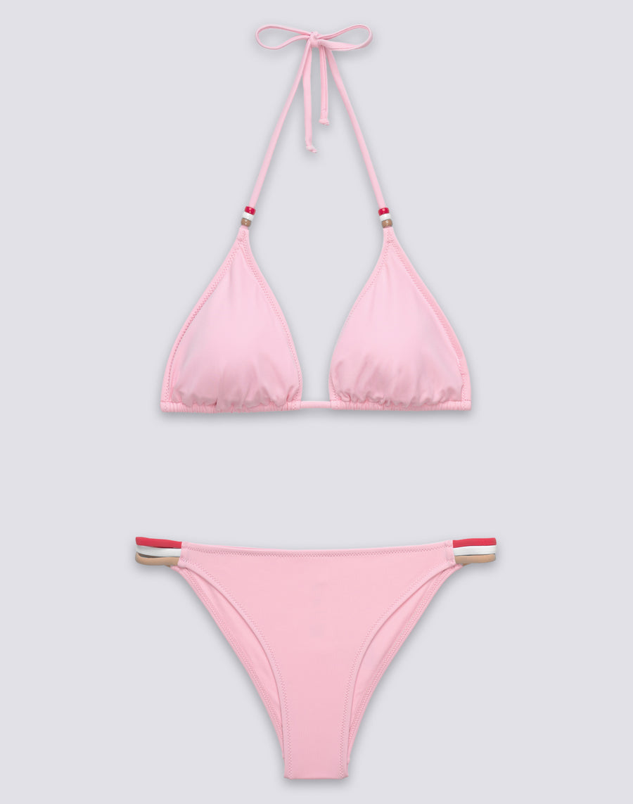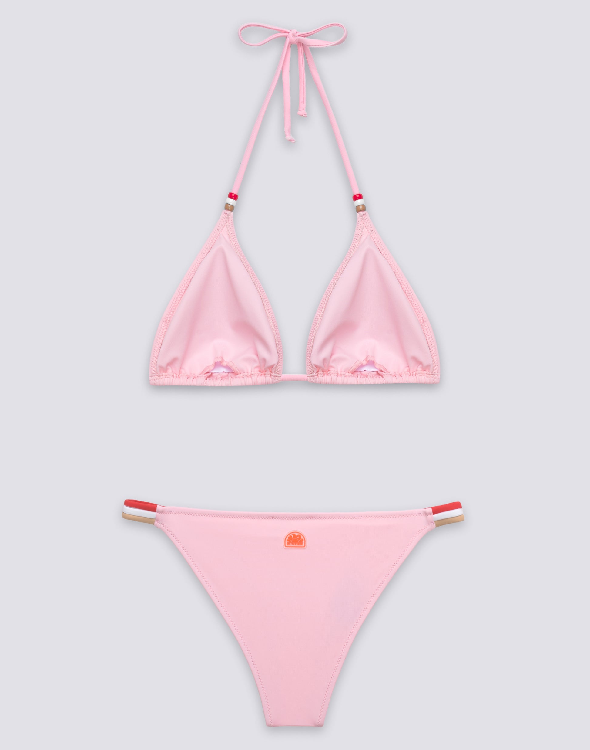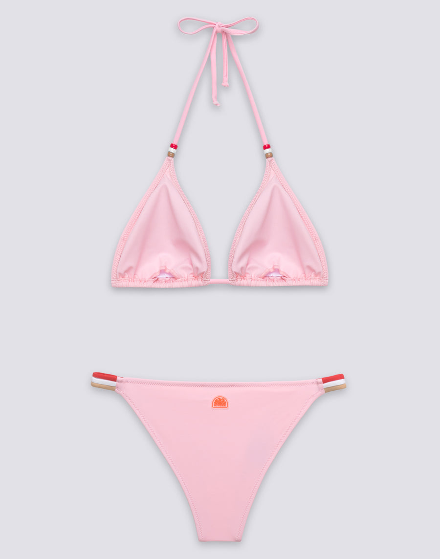 Fai spazio in valigia a questo completo bikini realizzato in tessuto ecosostenibile. Il triangolo è a vela, imbottito, con perline removibili sui laccetti. Lo slip è fisso con dettaglio laterale a tre bande tricolore in stile Sundek.