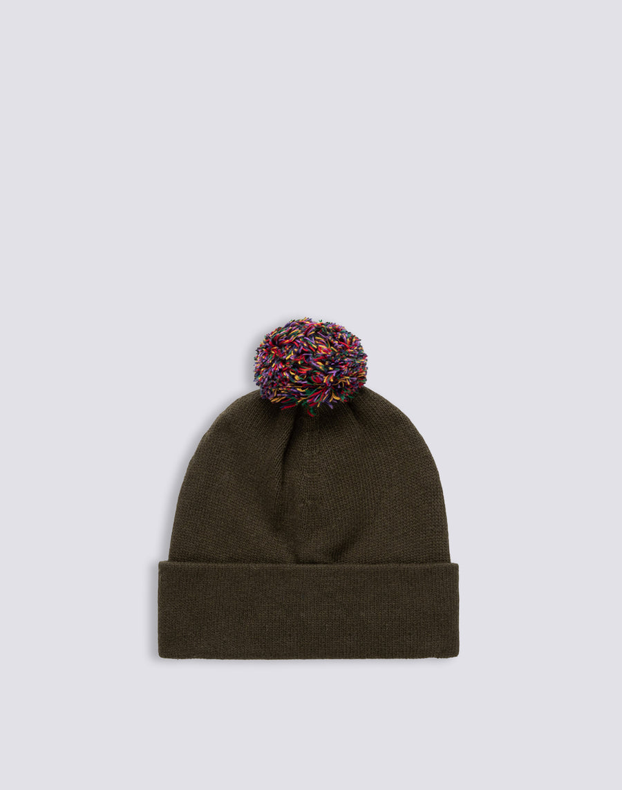Cute beanie with a multicoloured bobble and embroidered logo, designed to add a splash of colour to the grey winter months and a touch of fun to snowy days.