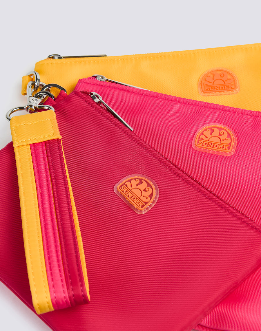 Mini clutch bag made up of 3 bags of different sizes with detachable keyring and rainbow details. Essential, to always carry with you to keep cards, keys, coins, small objects.
