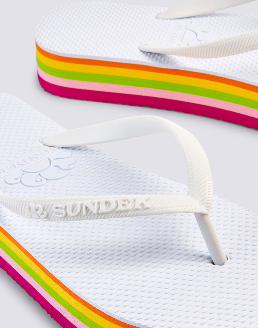 If you like shoes with a bit of height, choose these platform flip-flops for all your beach outings: contemporary, lightweight, comfortable, and finished with multicoloured details on the platform sole.