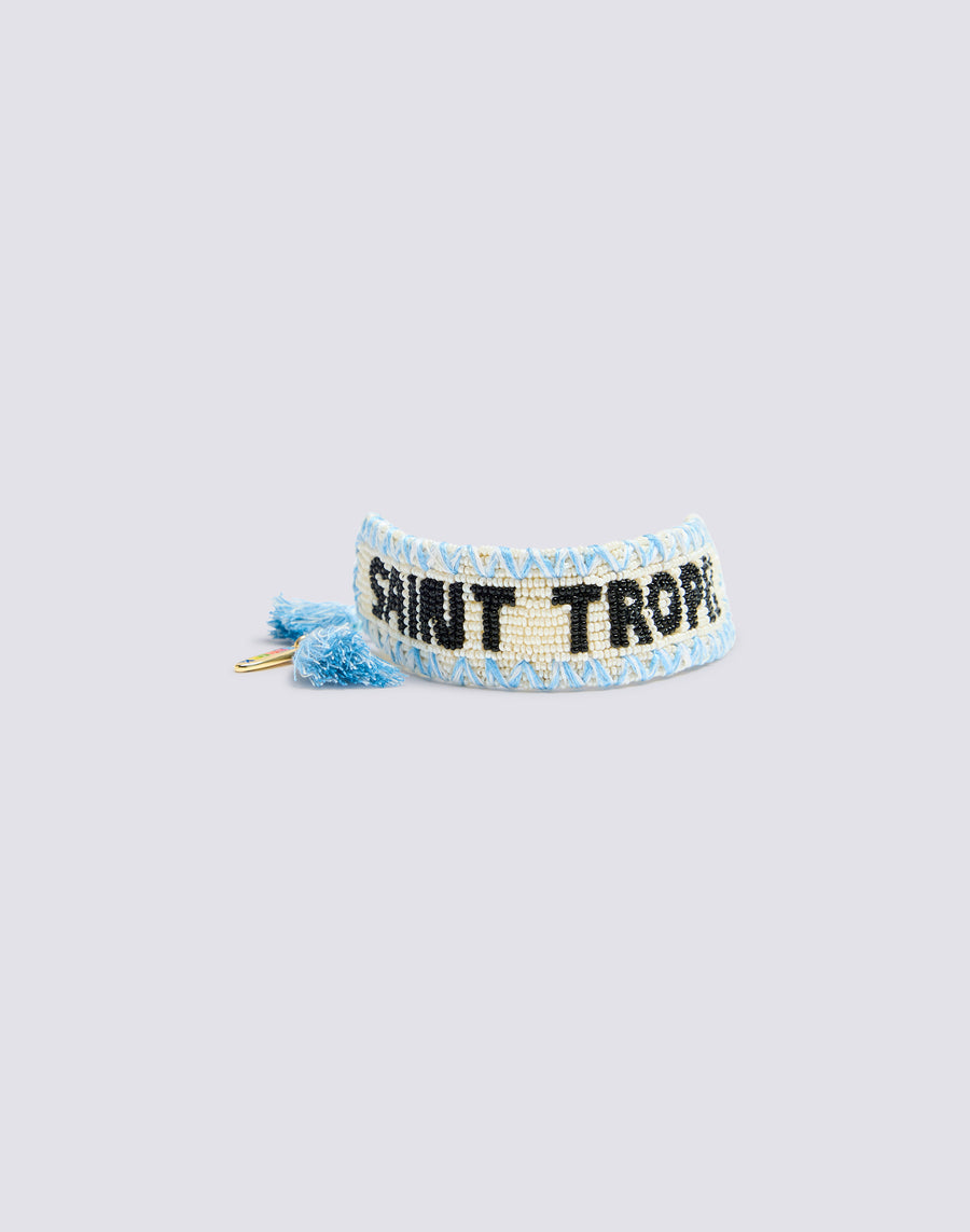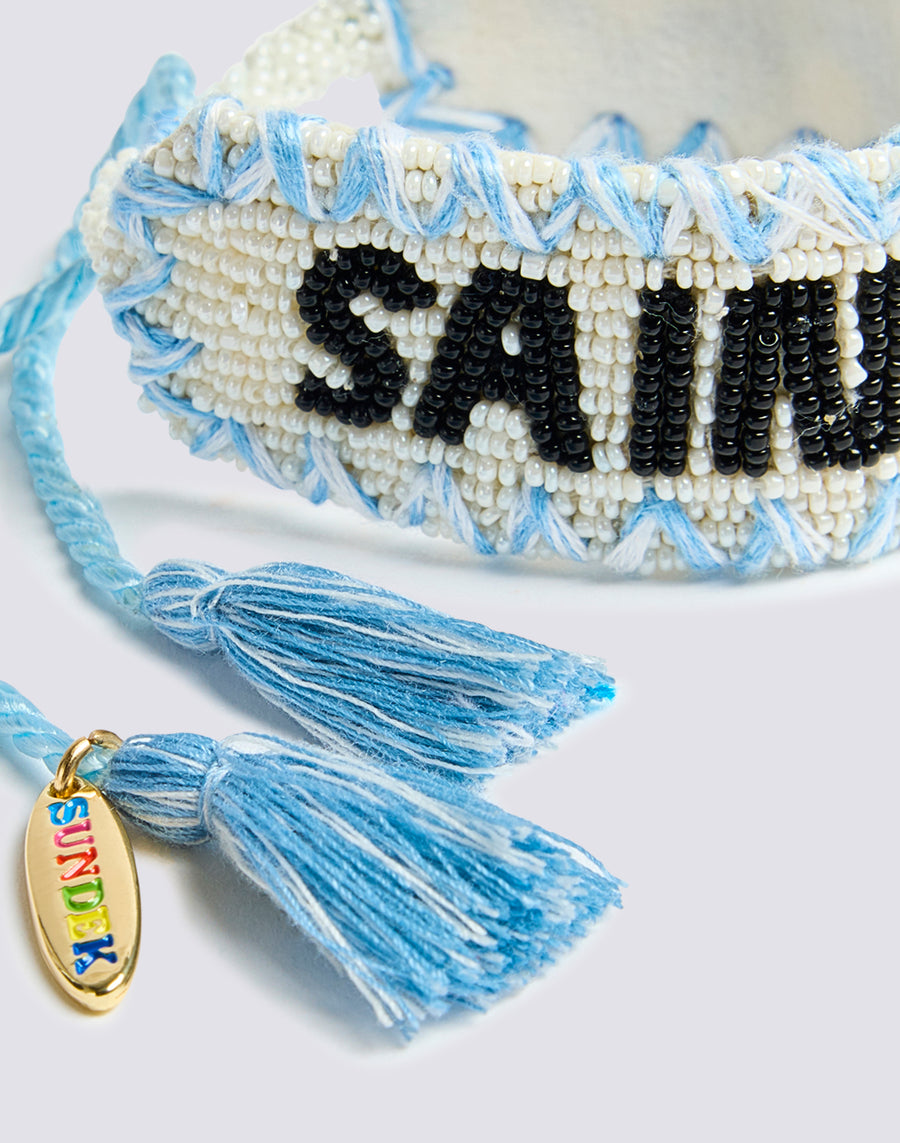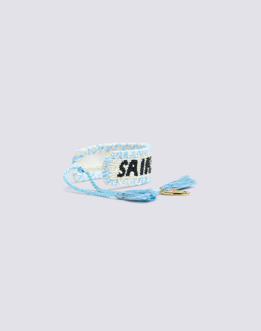 Hand embroidered bracelet with glass beads. Featuring an adjustable closure with tassels on the bottom and a surf-shaped metal charm. It is sold together with its dustbag printed with our iconic SK23 pattern and gold-colored logo.