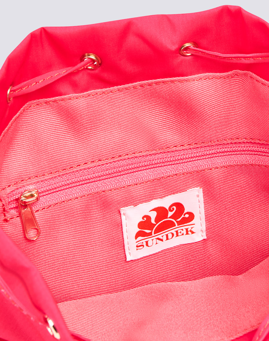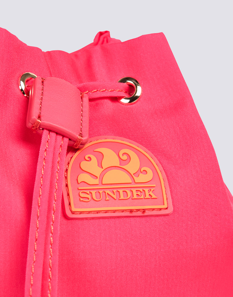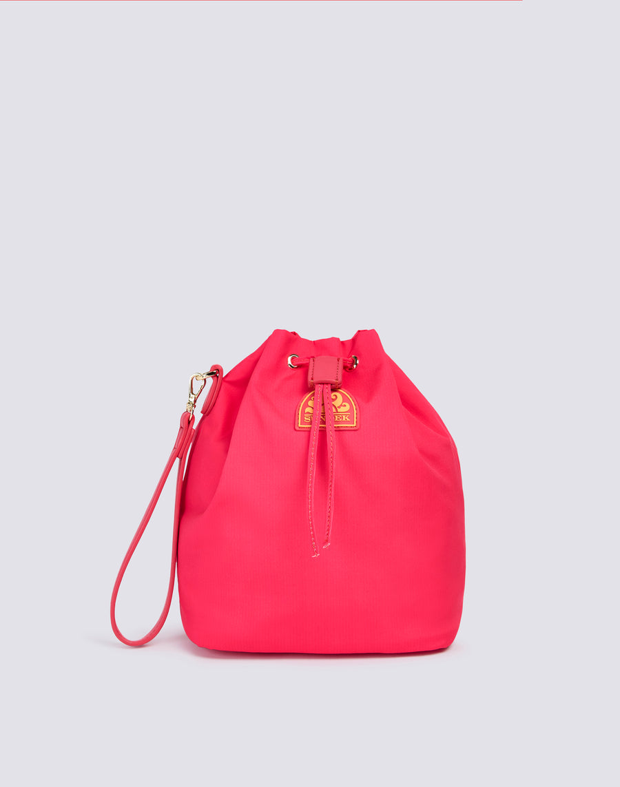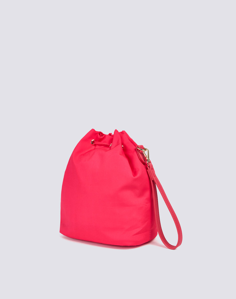 Solid colour drawstring bucket bag with side handle, elegant gold detailing and inside zip pocket. An original bag, to match with different looks and that will make you stand out.