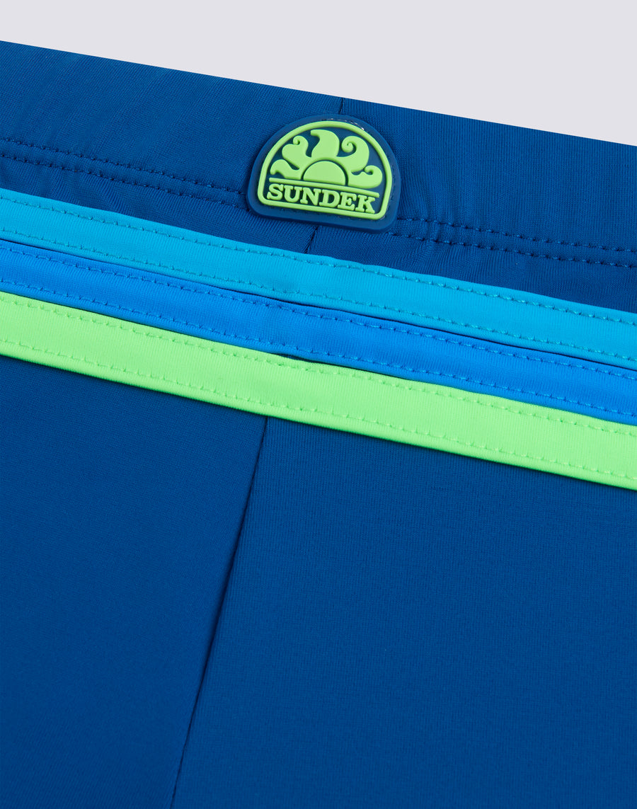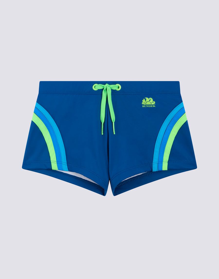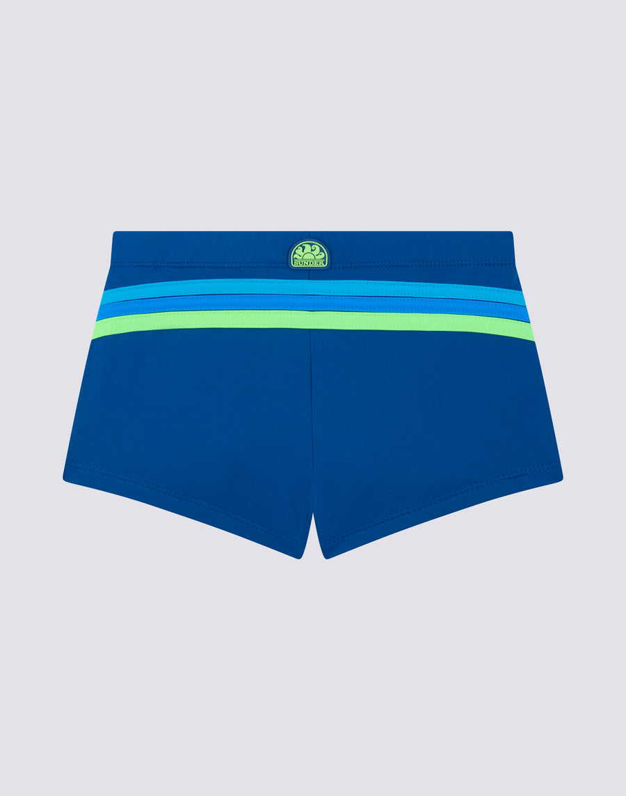 The children's beach boxer shorts are all about colour and not forgetting the environment, because they are made of ECONYL® regenerated nylon. Comfortable thanks to the elastic waistband and adjustable drawstring, it is the swimming costume that your child can easily wear to play and swim.