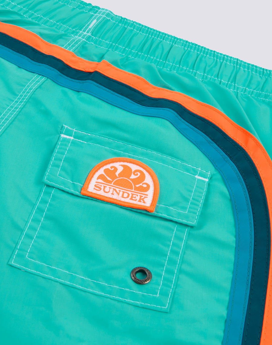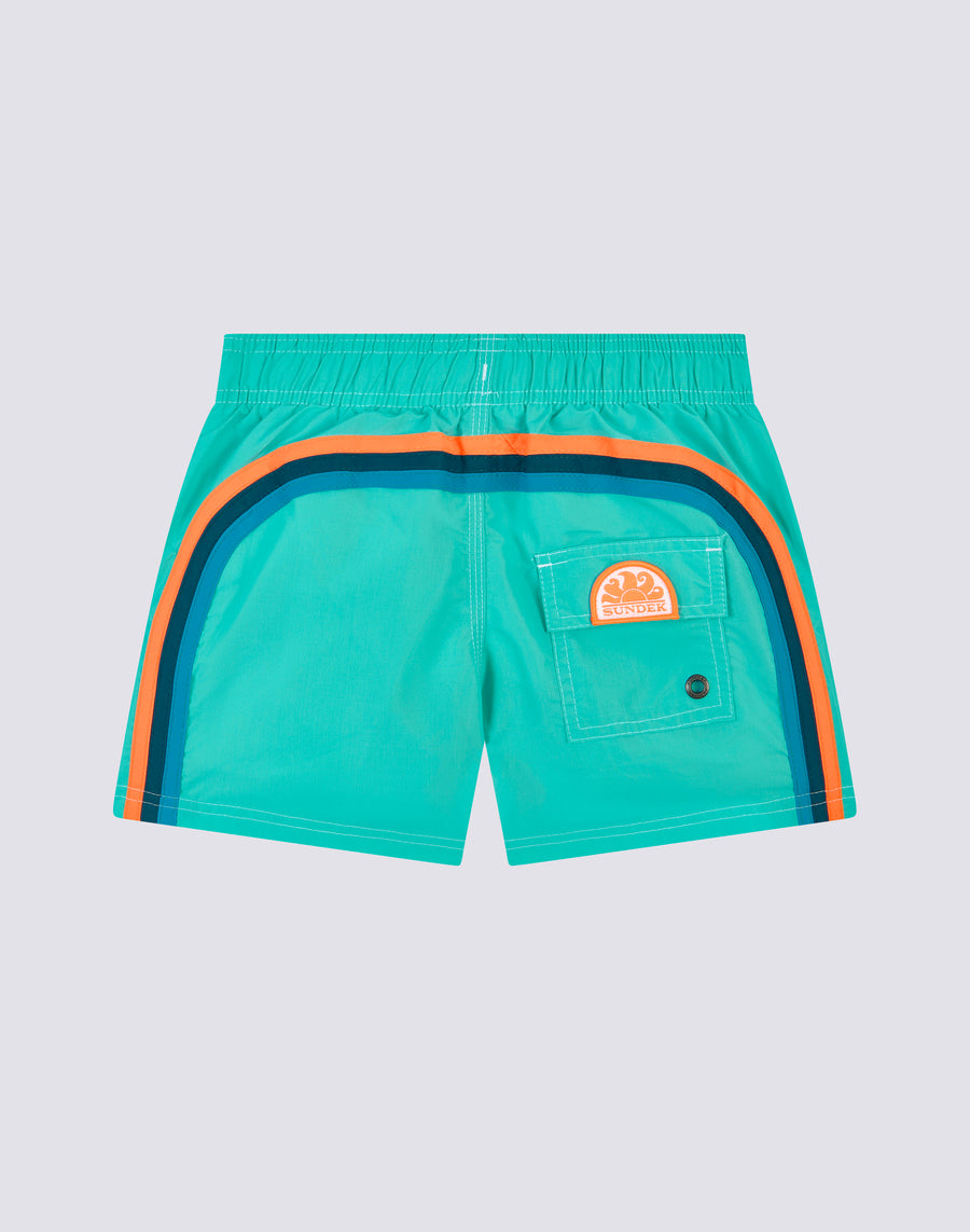 Intense colour and ultra-comfortable, quick-drying fabric for these children's beach shorts. A model that will accompany your child in his many activities on holiday, perfect for moving around and playing in complete freedom. It is made of our historical nylon-taffeta fabric and constructed with three-needle stitching that makes it durable. To pack year after year.