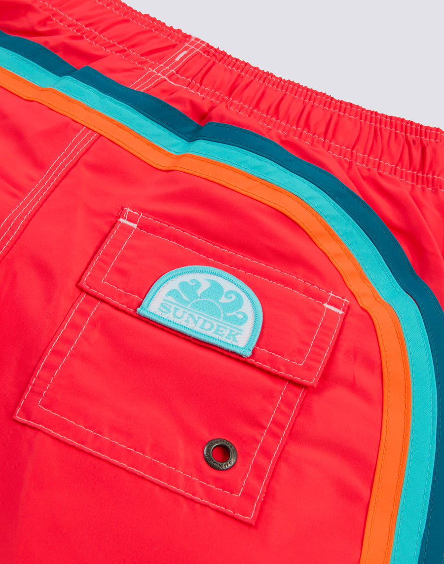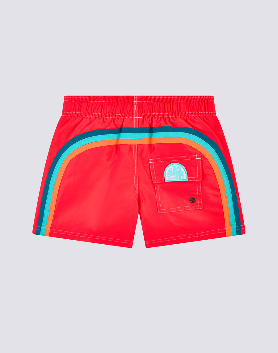 Intense colour and ultra-comfortable, quick-drying fabric for these children's beach shorts. A model that will accompany your child in his many activities on holiday, perfect for moving around and playing in complete freedom. It is made of our historical nylon-taffeta fabric and constructed with three-needle stitching that makes it durable. To pack year after year.