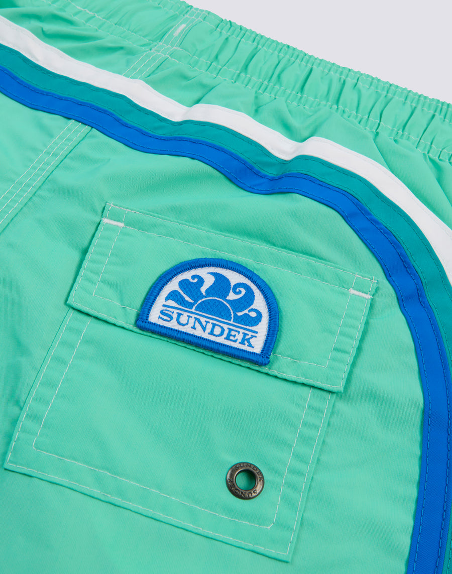 Intense colour and ultra-comfortable, quick-drying fabric for these children's beach shorts. A model that will accompany your child in his many activities on holiday, perfect for moving around and playing in complete freedom. It is made of our historical nylon-taffeta fabric and constructed with three-needle stitching that makes it durable. To pack year after year.