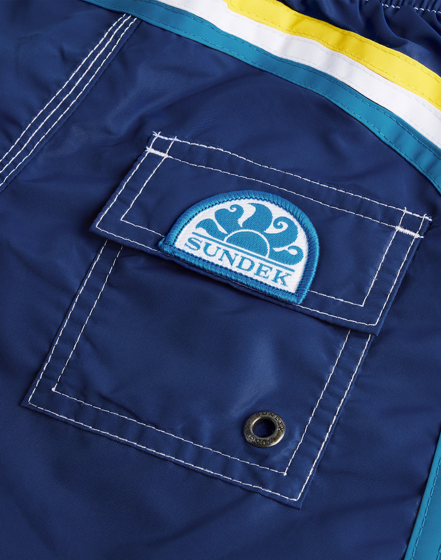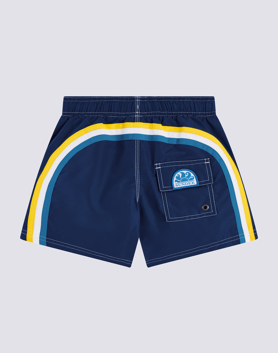 Intense color and hyper-comfortable, quick-drying fabric for these boys' swim shorts. A model that will accompany your child in his thousand holiday activities, perfect for moving and playing in complete freedom. it's made from our heritage nylon-taffeta fabric and constructed with three-needle stitching that makes it durable over time. To pack in your suitcase, year after year.