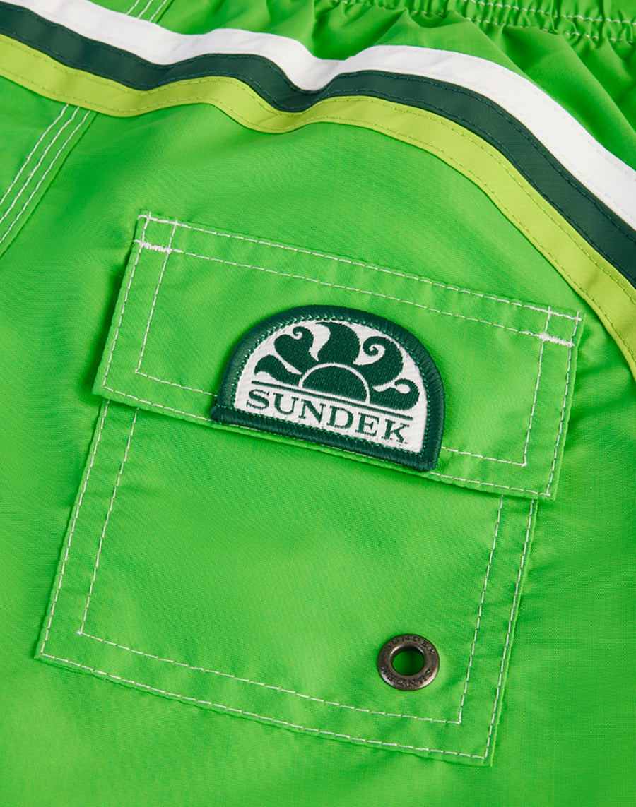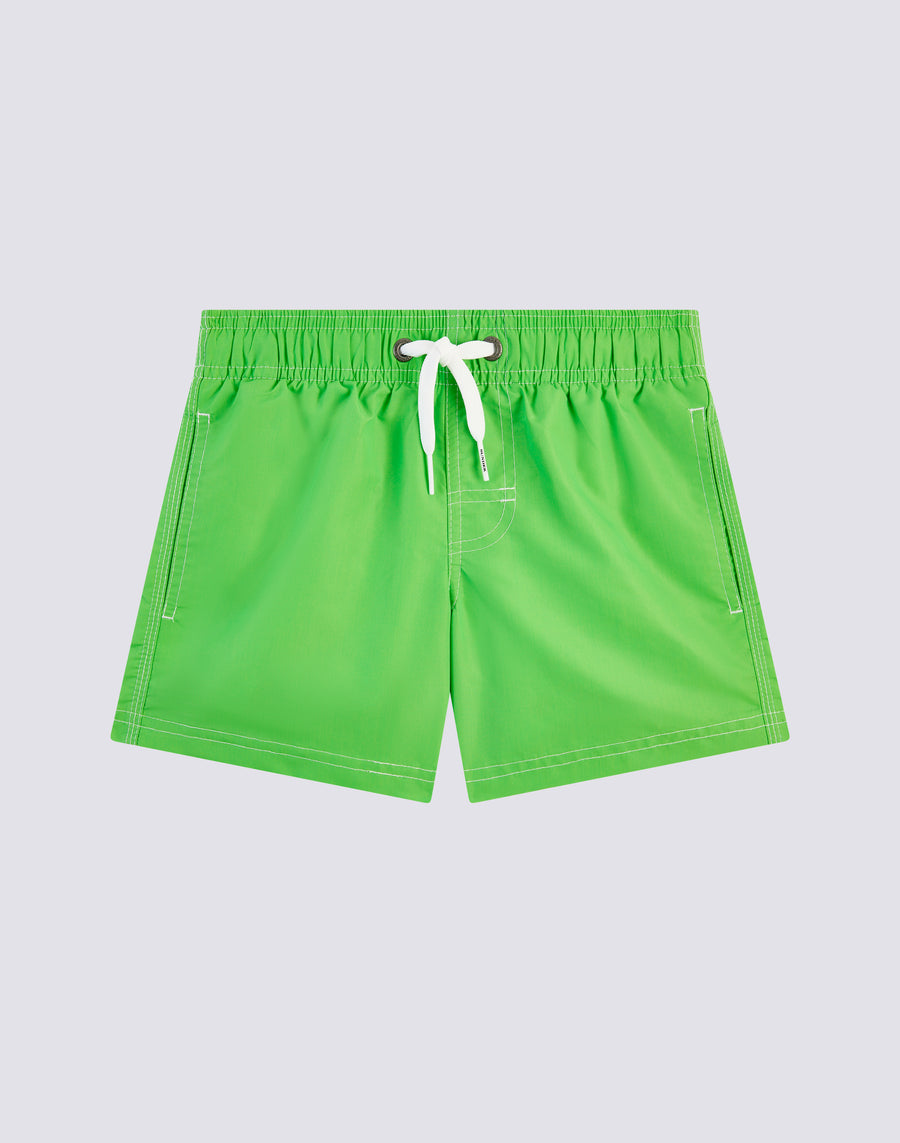 Intense color and hyper-comfortable, quick-drying fabric for these boys' swim shorts. A model that will accompany your child in his thousand holiday activities, perfect for moving and playing in complete freedom. it's made from our heritage nylon-taffeta fabric and constructed with three-needle stitching that makes it durable over time. To pack in your suitcase, year after year.