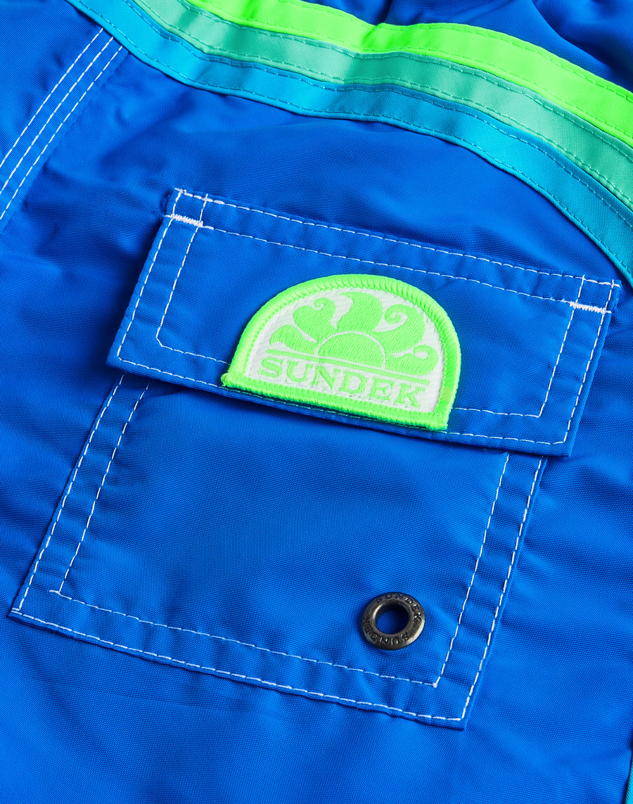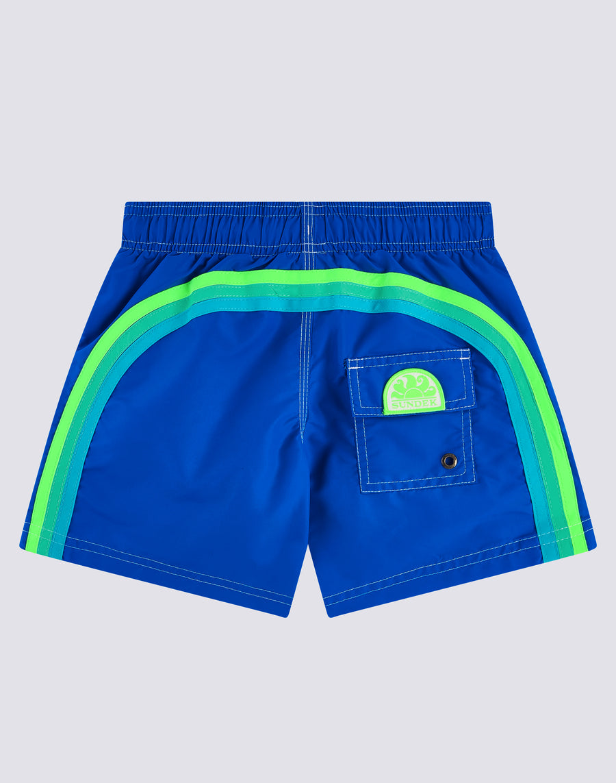 Intense color and hyper-comfortable, quick-drying fabric for these boys' swim shorts. A model that will accompany your child in his thousand holiday activities, perfect for moving and playing in complete freedom. it's made from our heritage nylon-taffeta fabric and constructed with three-needle stitching that makes it durable over time. To pack in your suitcase, year after year.