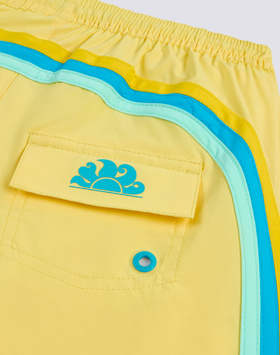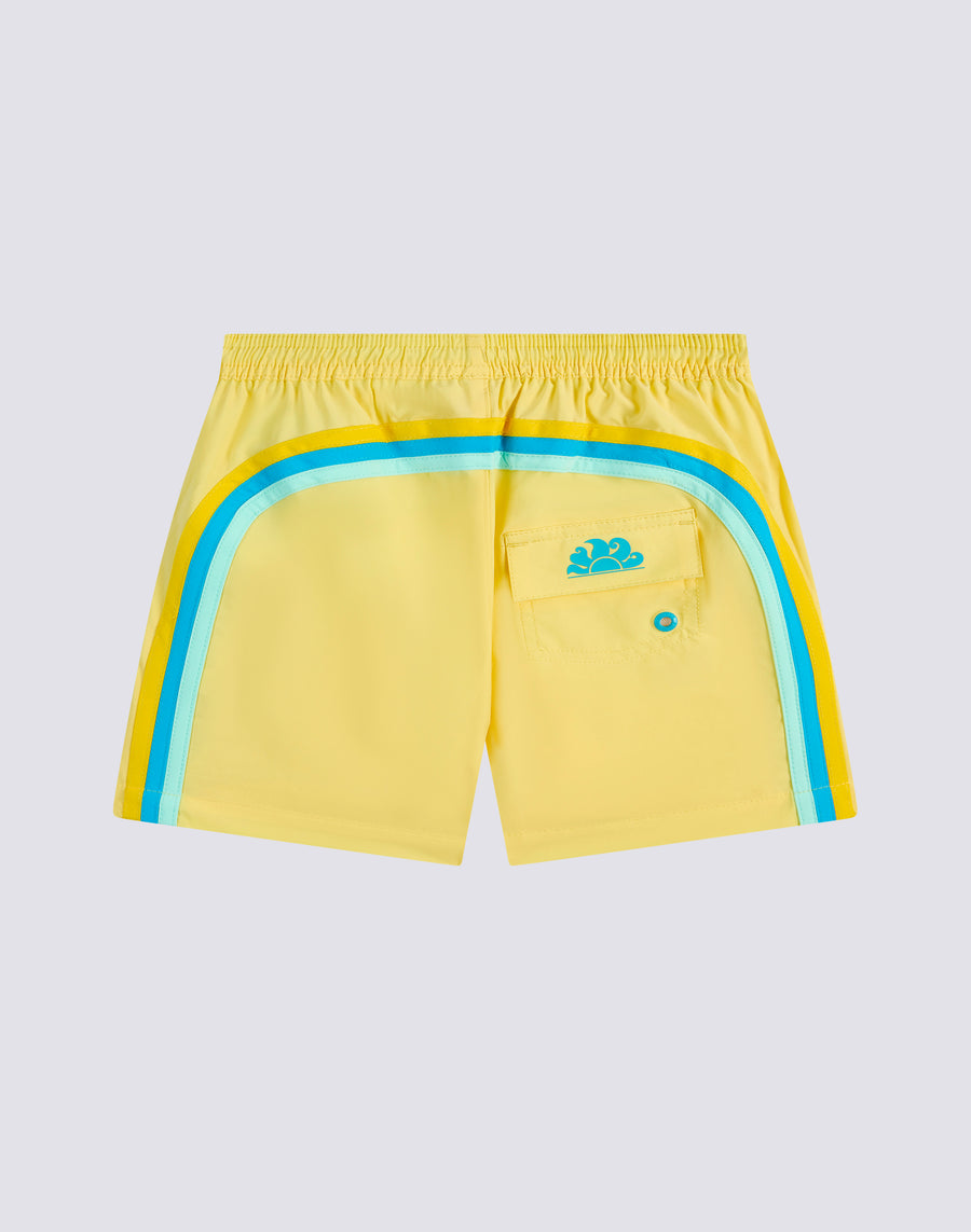 Intense colour and ultra-comfortable, quick-drying fabric for these swimming shorts for boys. A model that will accompany your child in his many activities on holiday, perfect for moving and playing in complete freedom. Lightweight, durable, quick-drying and made of 4 Way Stretch fabric. It has our classic three-needle stitching for added durability and our iconic rainbow on the back.
