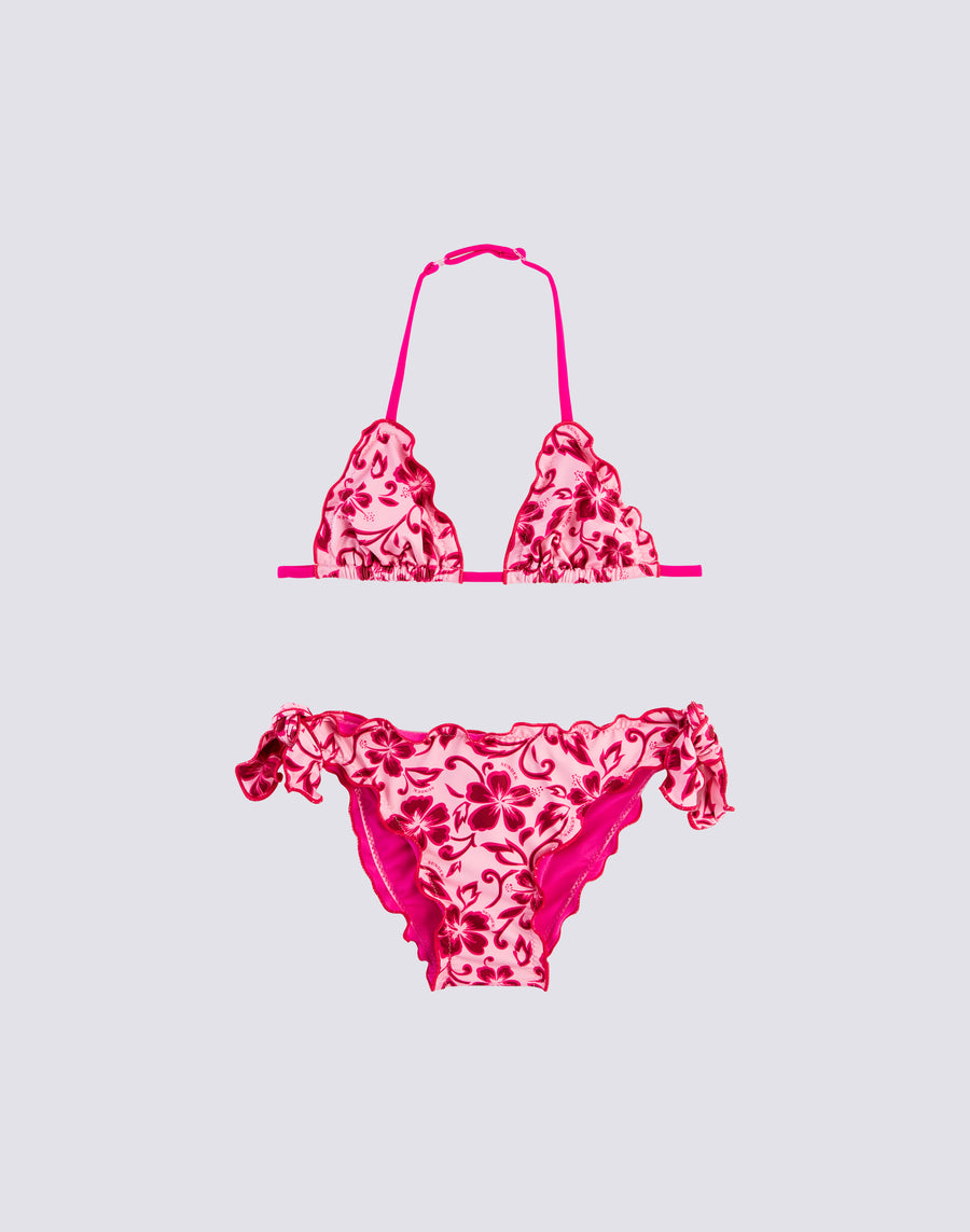 Add a touch of color to her summer with our SK23 Hibiscus print bikini for girls. Perfect for days at the beach and having fun, this swimsuit is made with a colorful and floral print.