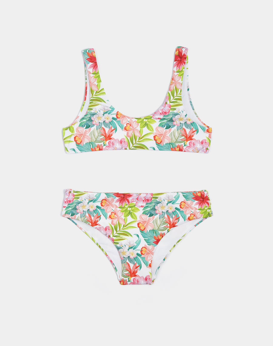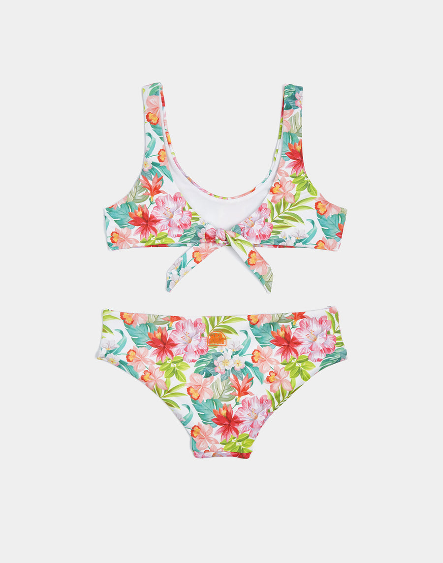 All the colors of Polynesia enclosed in this two-piece swimsuit for girls, consisting of a sports top that can be closed on the back with a bow and fixed bottom. Perfect for games on the beach or with friends in the pool. Also available in the coordinated model for adults.