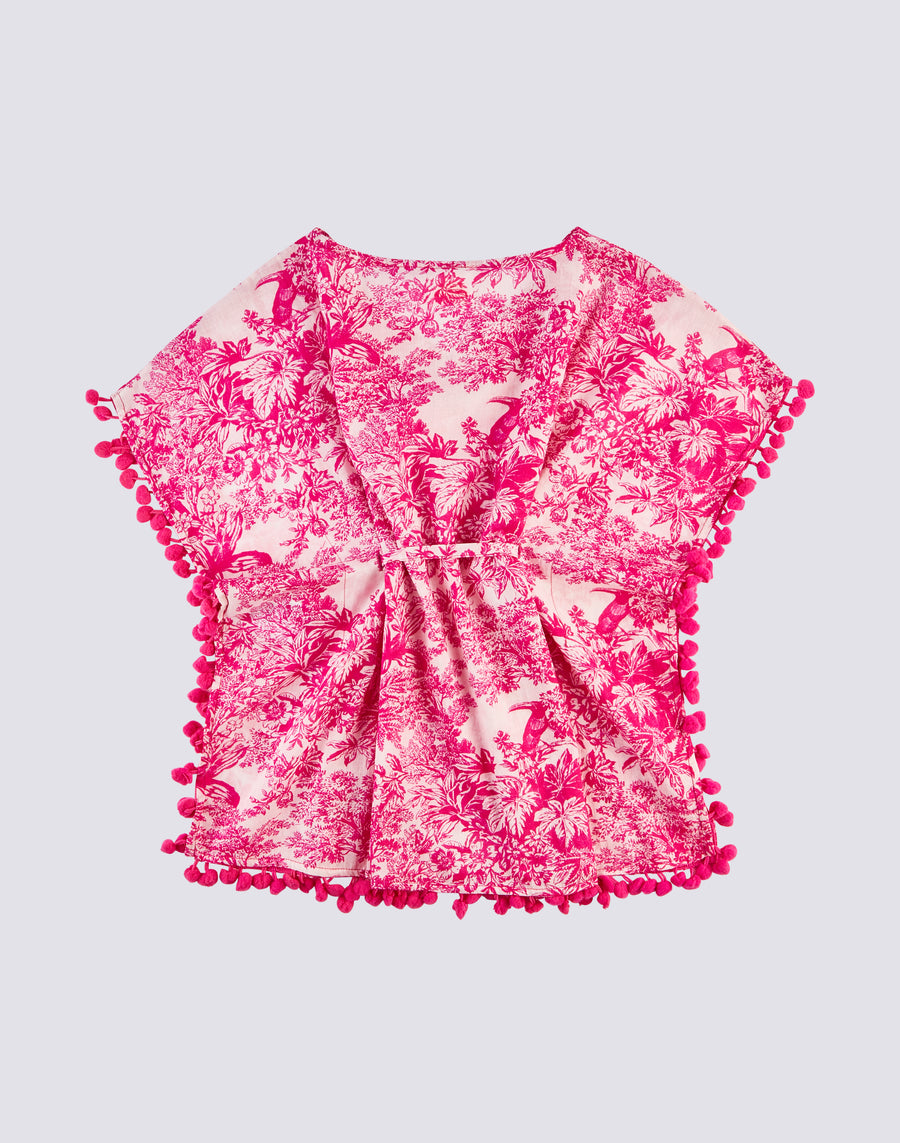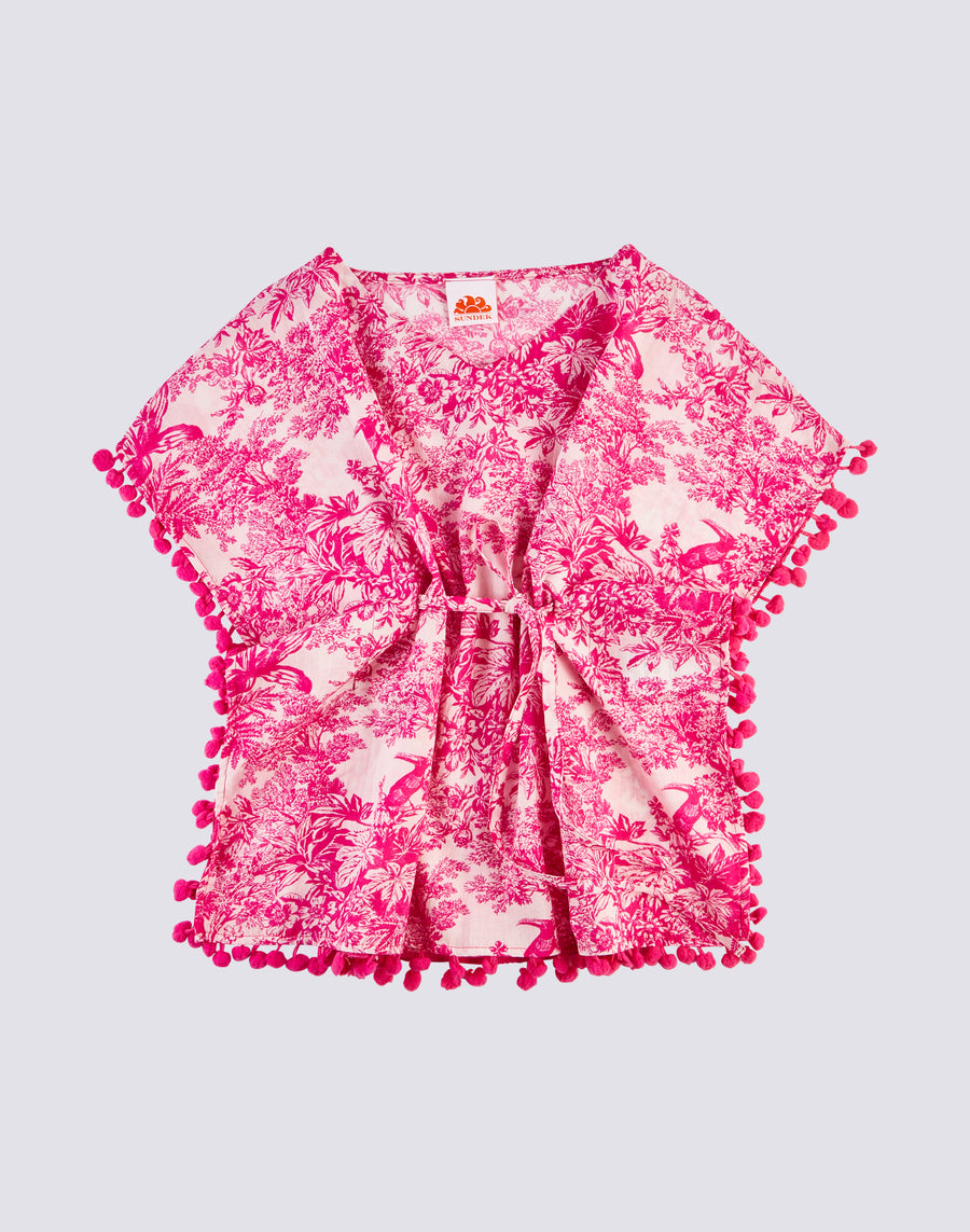 This girl's kaftan is perfect for a refined and elegant look. Printed with a toile de jouy pattern, it will make her feel romantic and fashionable. Ideal for special occasions or simply for a touch of class on days at the beach.