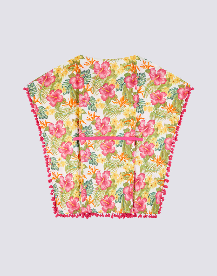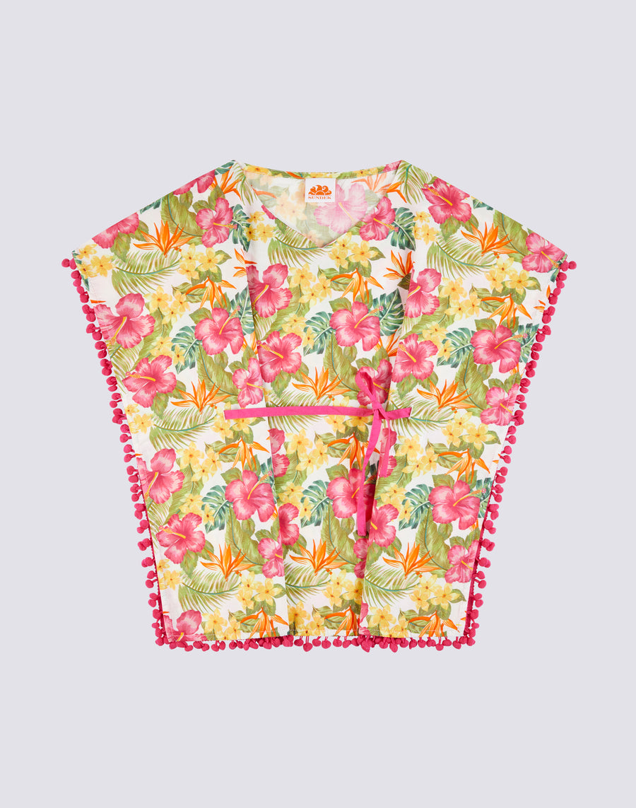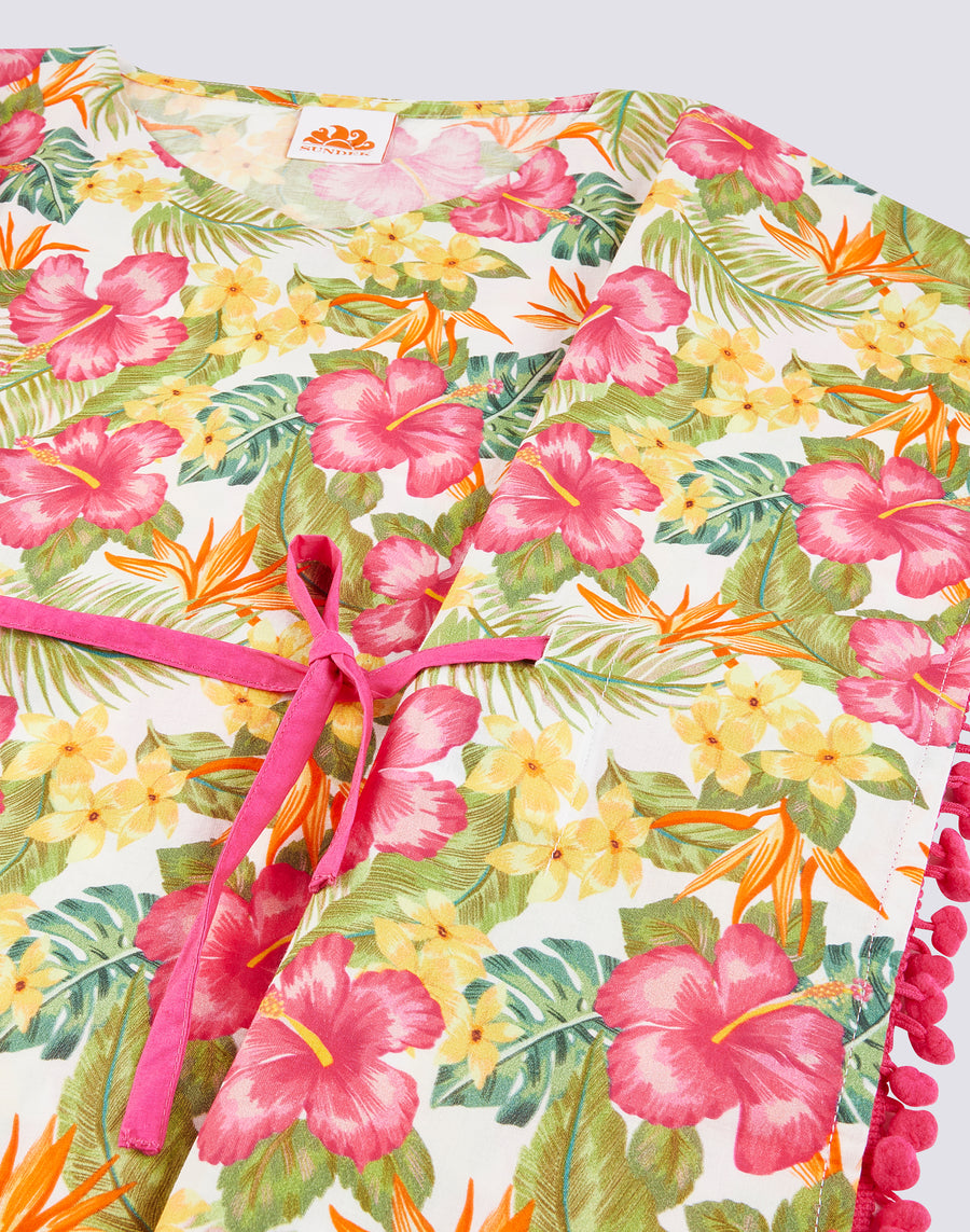 Mini kaftan for girls with lively tropical pattern. To be worn over the coordinated costume.