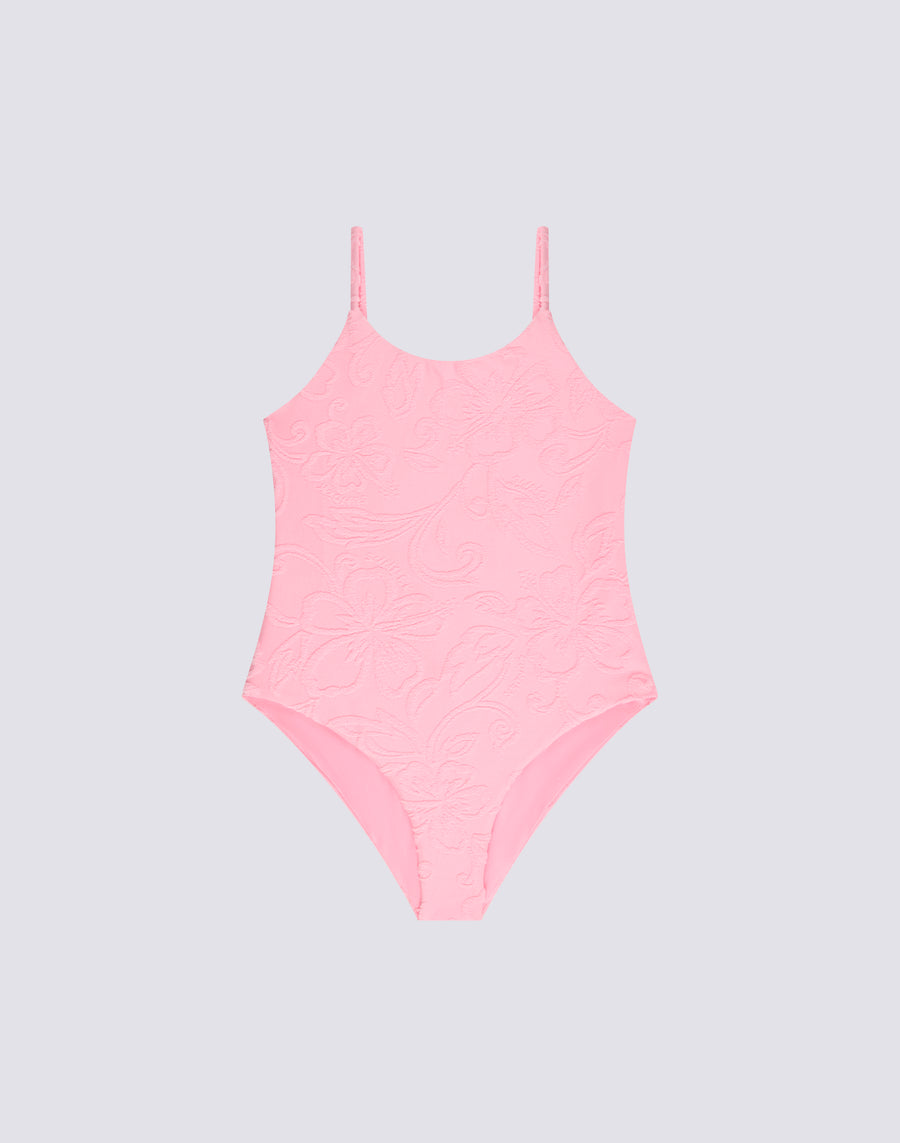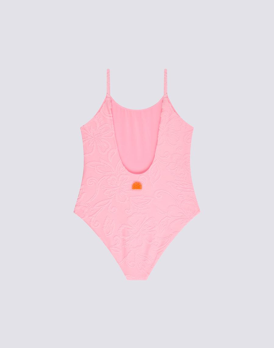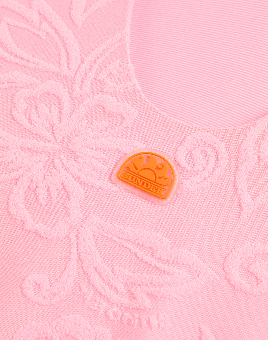 Girls' terry cloth one-piece swimsuit with SK23 motif and cubic beads as detail. Soft and comfortable for endless swims and games on the shore.