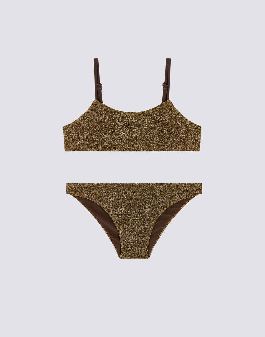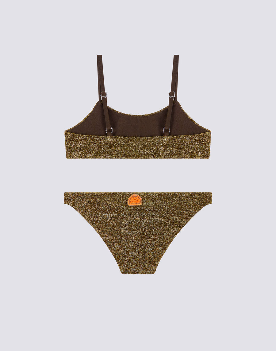 To shine under the sun, choose the girls' bikini in lurex. Young girls won't want to miss out on this beachwear ensemble with a bandeau top and a bright and comfortable lurex bottom.