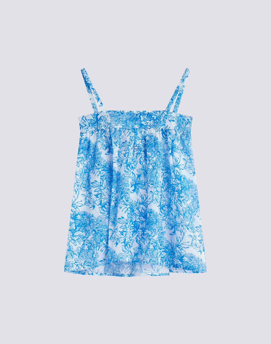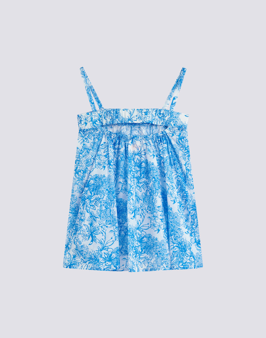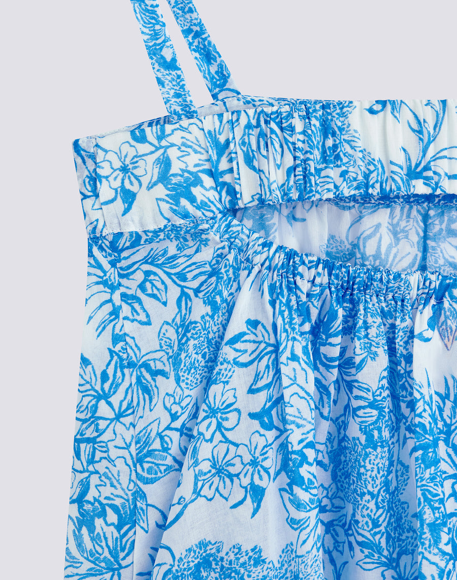 Sleeveless short dress for girls with an elegant Fleur de Joie print. With elasticated, gathered shoulder straps and a tie at the back, it is the ideal garment to wear for special occasions.