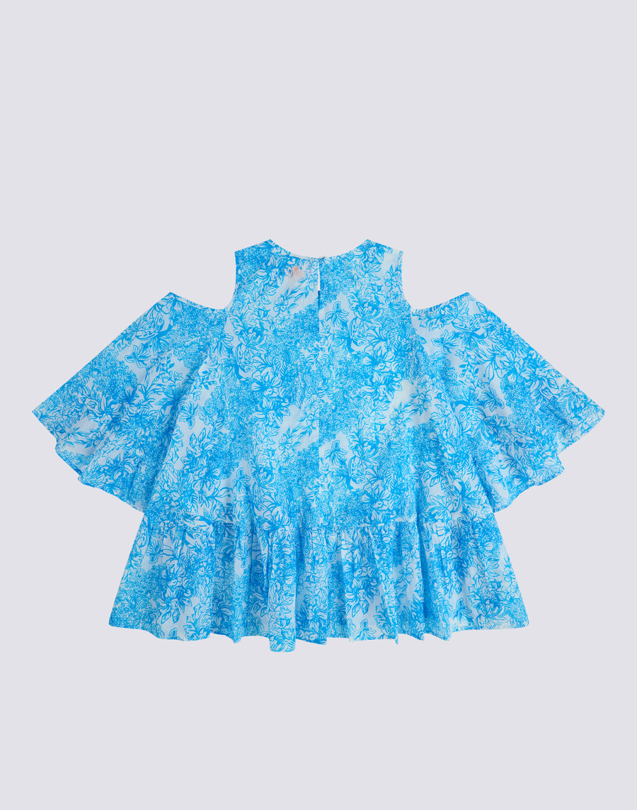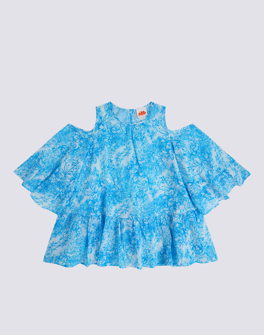 Girl's short dress with elegant Fleur de Joie print. With long sleeves and an opening at the shoulders, it is the ideal garment to wear for special occasions, perhaps coordinated with the same model in the adult version.