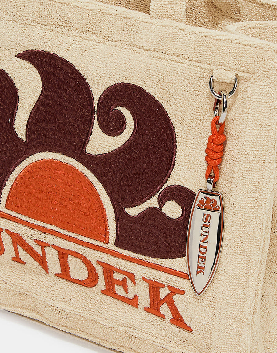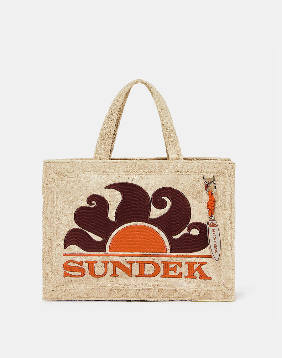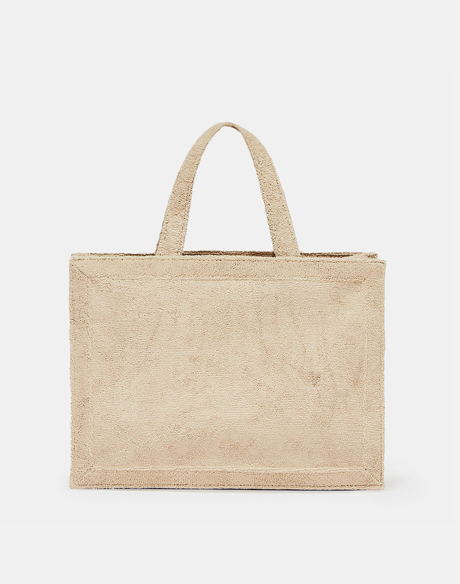 Medium towelling beach handbag with an embroidered logo. Iconic surfboard charm.