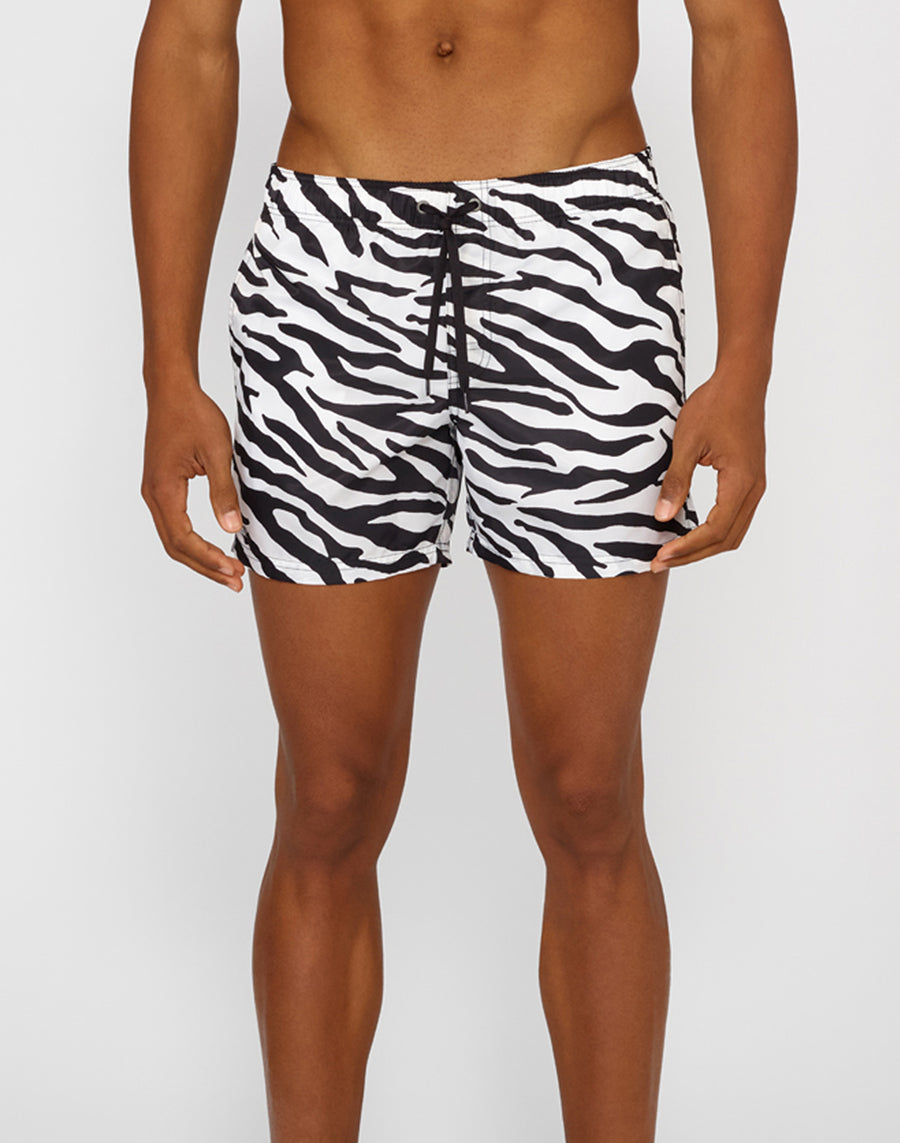 Get ready to ride the next wave with the elastic-waisted short swimming costume in a special animal print. Grit and character come together in this low-waisted swimsuit made from satin fabric.
