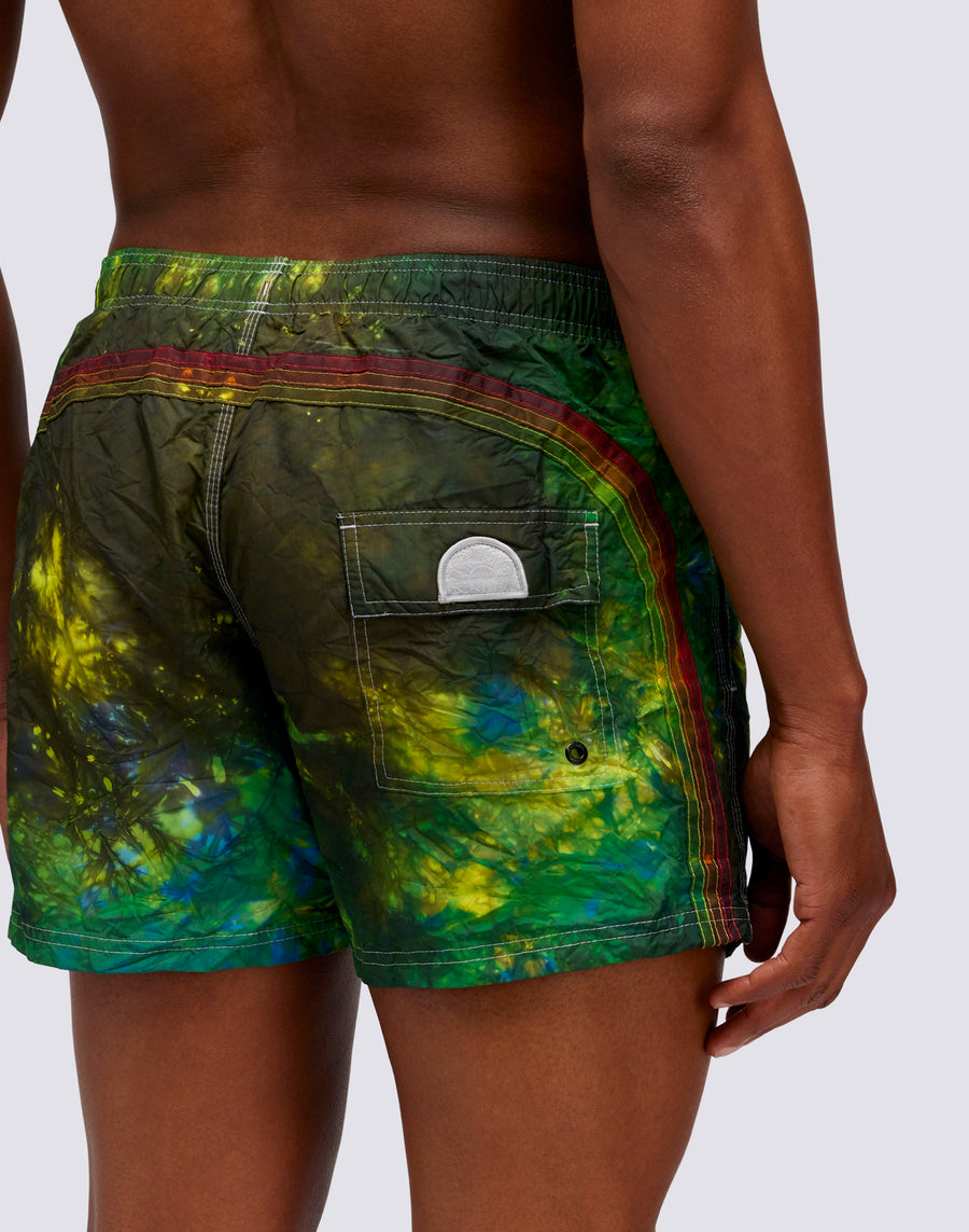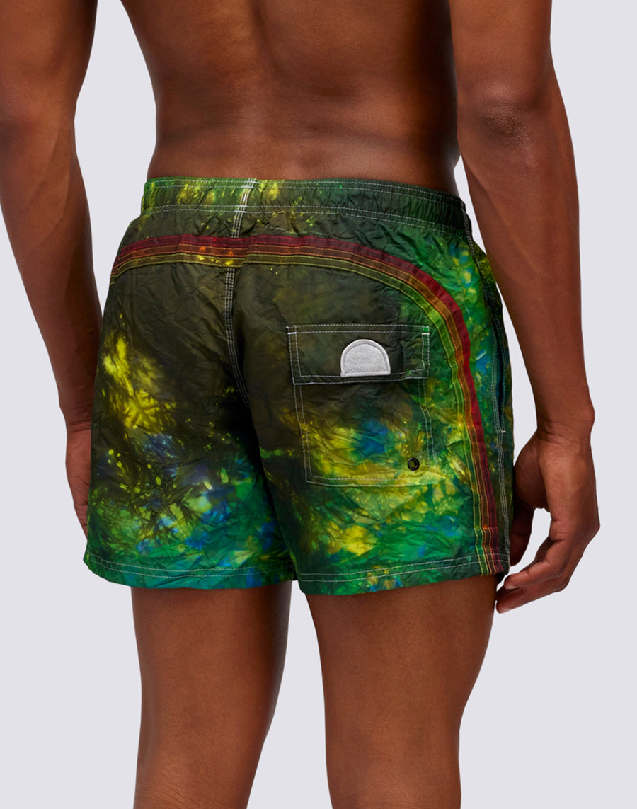 Get ready to ride the next wave with the short elasticated waist swimsuit with special batik workmanship, treated and dyed with artisanal techniques. The heritage nylon taffeta fabric and pattern construction makes it quick drying and super durable season after season.