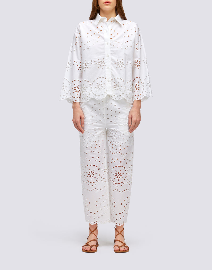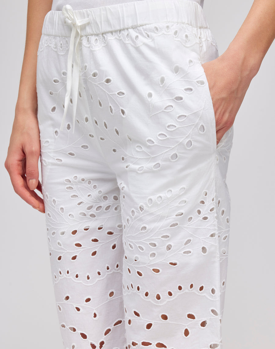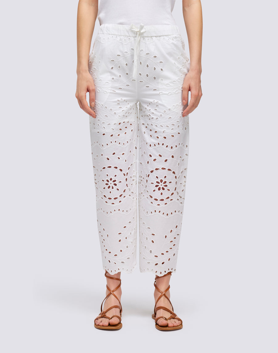 These long trousers are perfect for a romantic and elegant look. Made from broderie anglaise cotton, they are light and breathable. The drawstring waist allows you to adjust the fit for a personalized fit. Add a touch of romance to your wardrobe with these trousers.