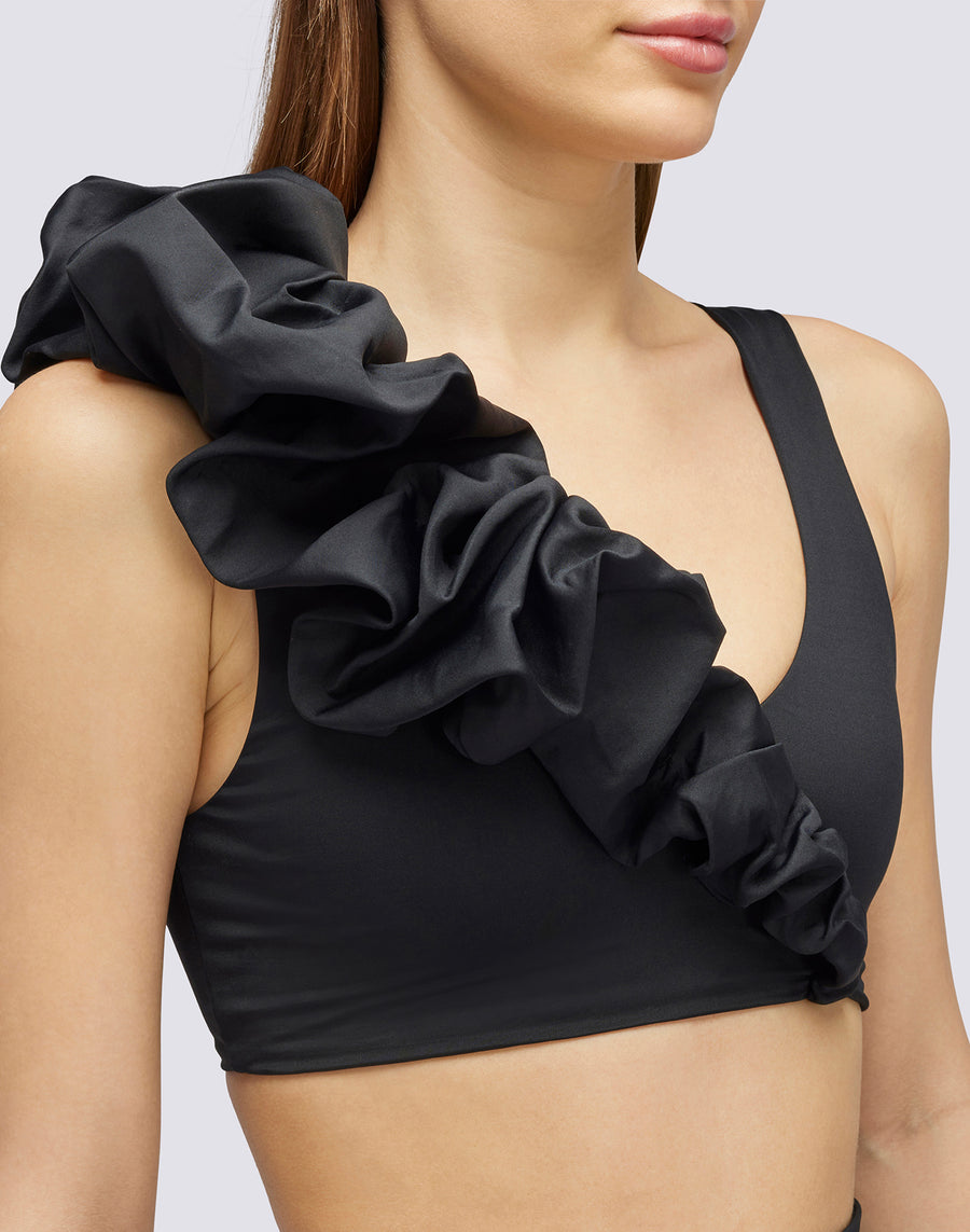 An elegant rouche covers this cupless bralette top in soft lycra, almost creating a one-shoulder effect, for a refined and elegant romantic beach style. Pair it with a high-waisted culotte, a pareo or wear it under a blouse: the romantic effect will not be missing.
