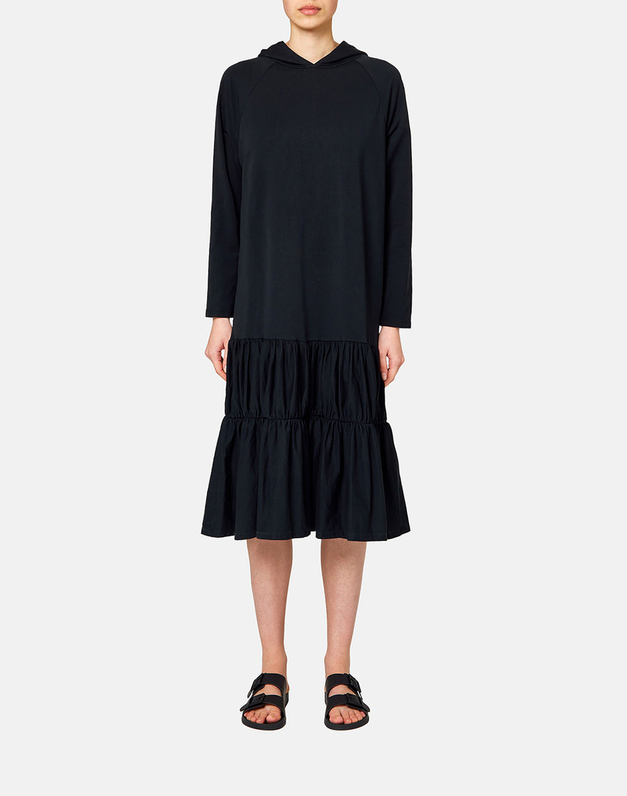 This versatile long dress is made from stretch cotton fleece for a sporty flair, finished with feminine ruffles at the hem to create an interesting contrast.