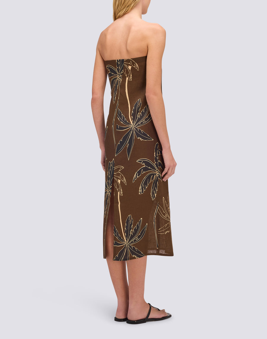 Long linen dress with bare shoulders and Golden Palm pattern. Ideal for hot summer days, wear it with a bikini set in the same pattern; you can wear it to the beach or even in urban settings (a walk, an aperitif).