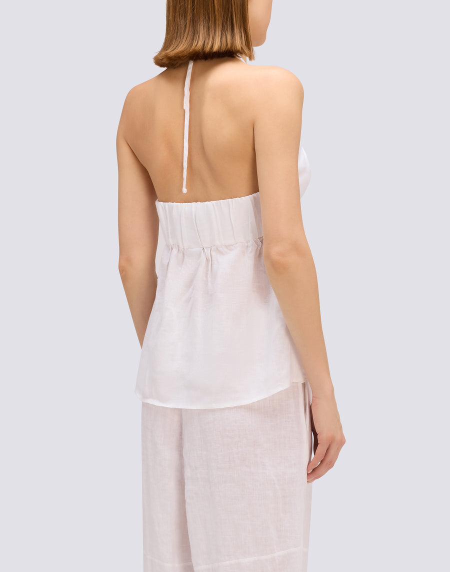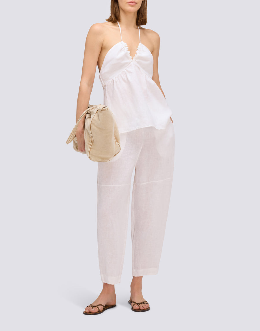 Garment-dyed linen sleeveless top with a V-neckline and lacing at the back of the neck. Ideal if you are looking for a comfortable, cool, essential but versatile garment for your next look.