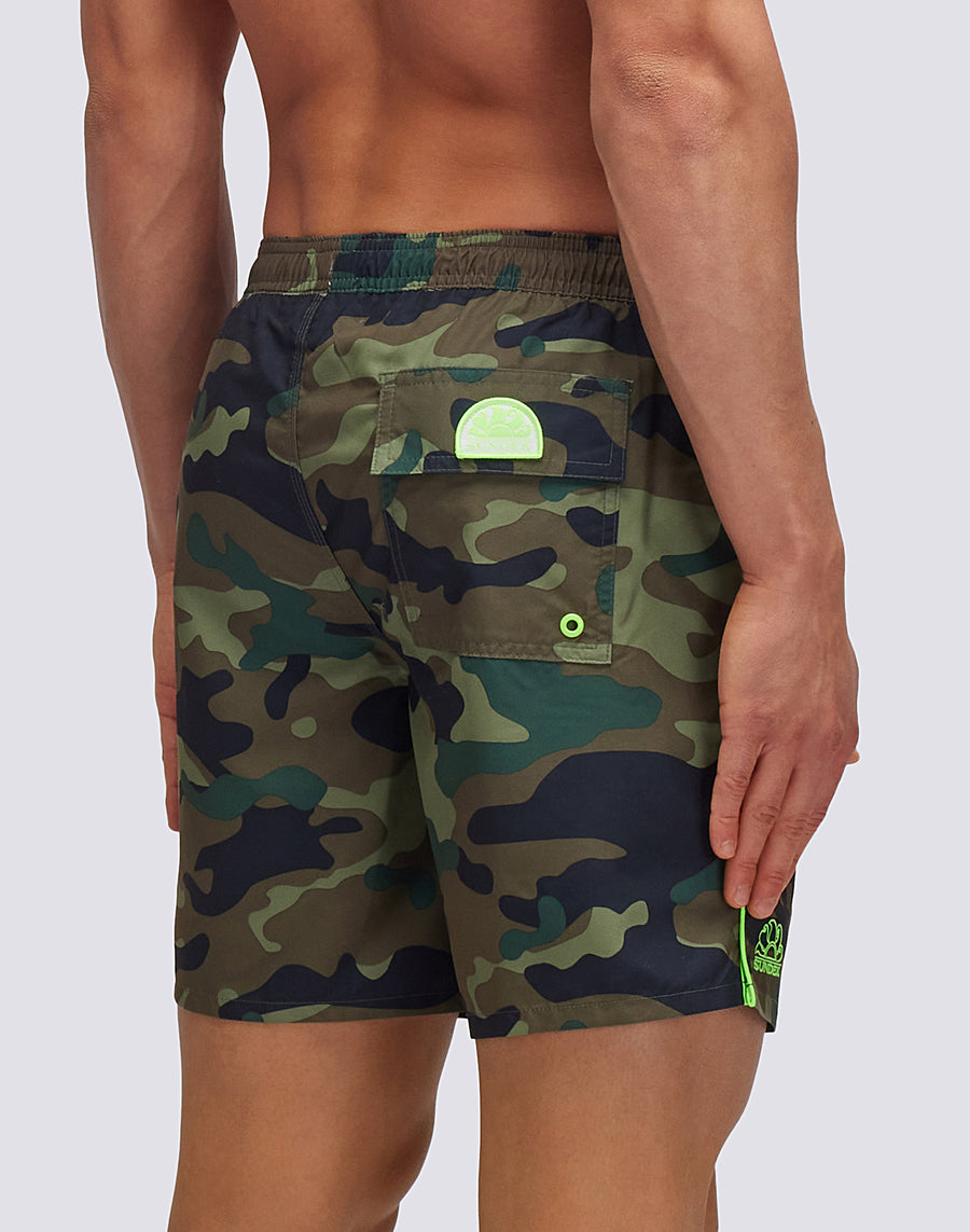 The camouflage print won't let your average Sundek swimming costume go unnoticed with its elasticated waist, comfortable and perfect thanks to the three-needle stitching that makes it super resistant. Made of basic micropeach polyester, it has a small pocket on the back and contrasting piping on the sides. External leg length 16"/41 cm (in size M).