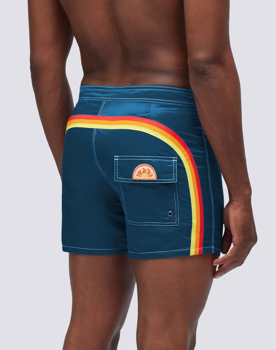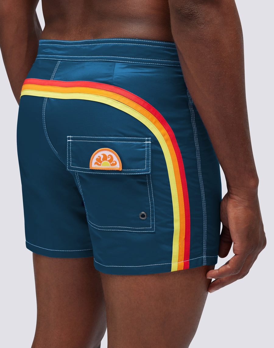 Men's shorts with a shaped waistband in satin polyamide fabric, therefore with a shiny finish. The model developed is a new edition of the historic Sundek 501, an icon of the brand. The rainbow detail on the back also features the historic colors. Outside thigh length 14"/35 CM (size 32).
