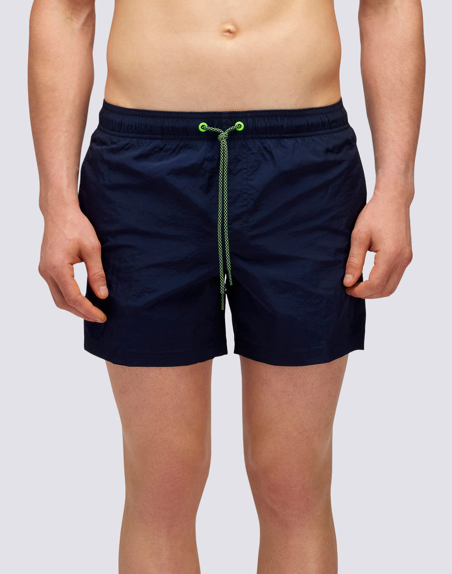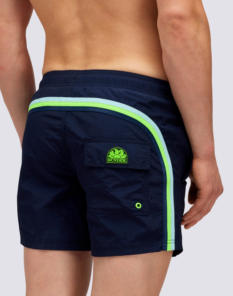 Solid-color short men's swimsuit in bright colors. Lightweight, durable, dries super fast and is made of nylon taffeta, Sundek's iconic fabric. It has our classic three-needle stitching for added durability and our rainbow on the back.