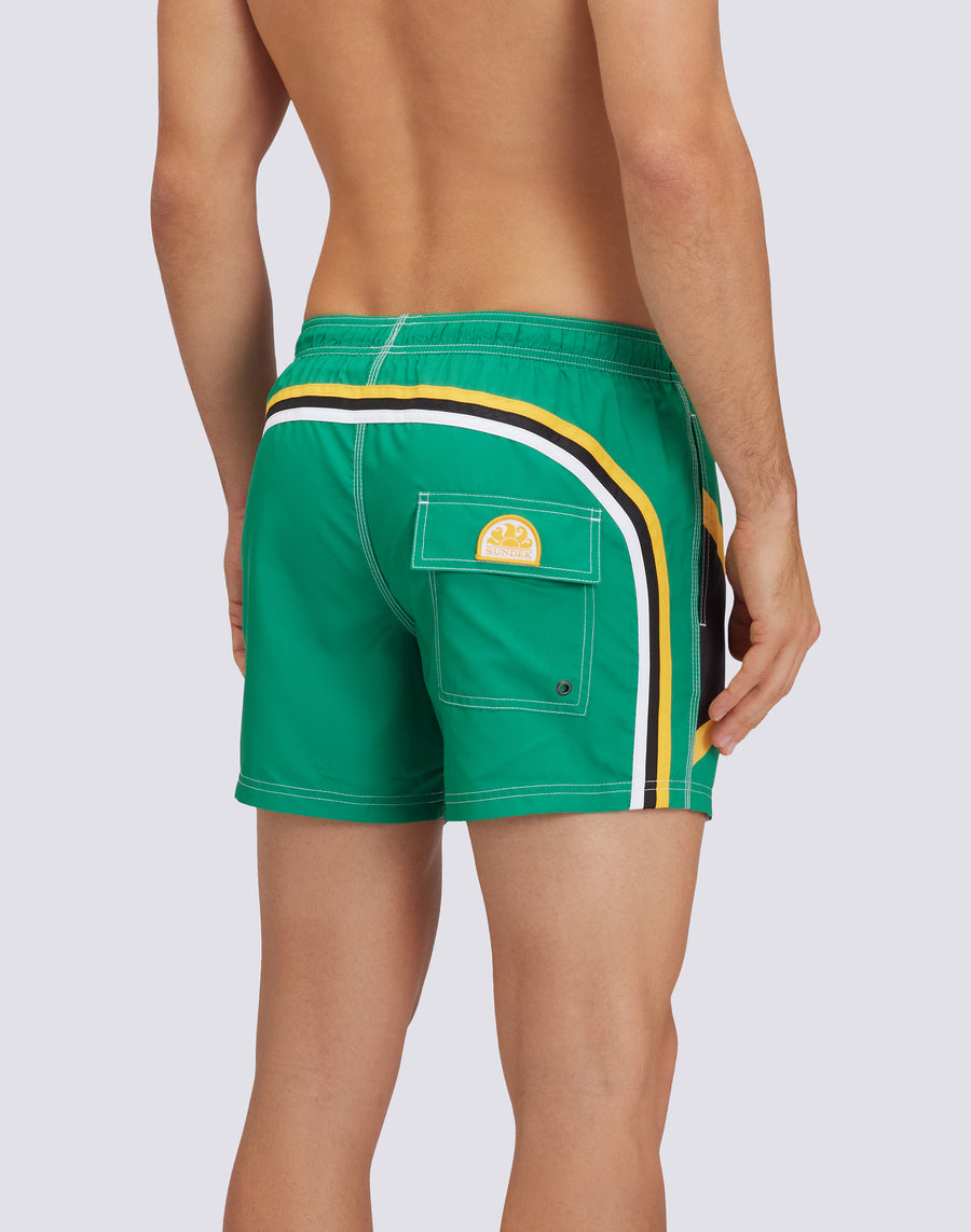 Men's shorts swimsuit made of Repreve® recycled fabric, super-lightweight quick-drying fabric. Sundek iconic rainbow detail on back and South African flag representation. Outer thigh length 14"/35 CM (in size M).