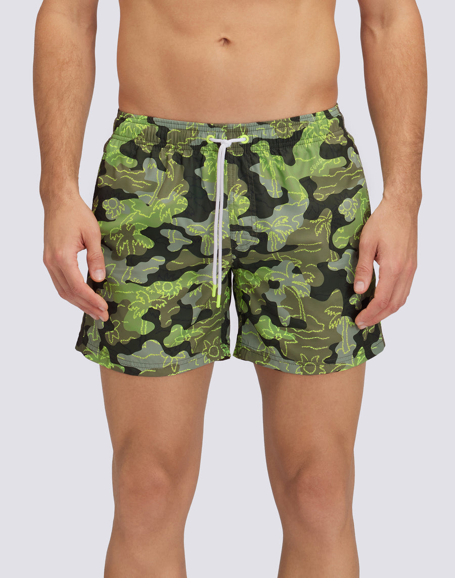 Swimshorts with elasticated drawstring waist, in lightweight Repreve® fabric recycled from plastic bottles. With Inside Palm print and the traditional Sundek rainbow on the back. Outer thigh length 14"/35 cm (in size M).