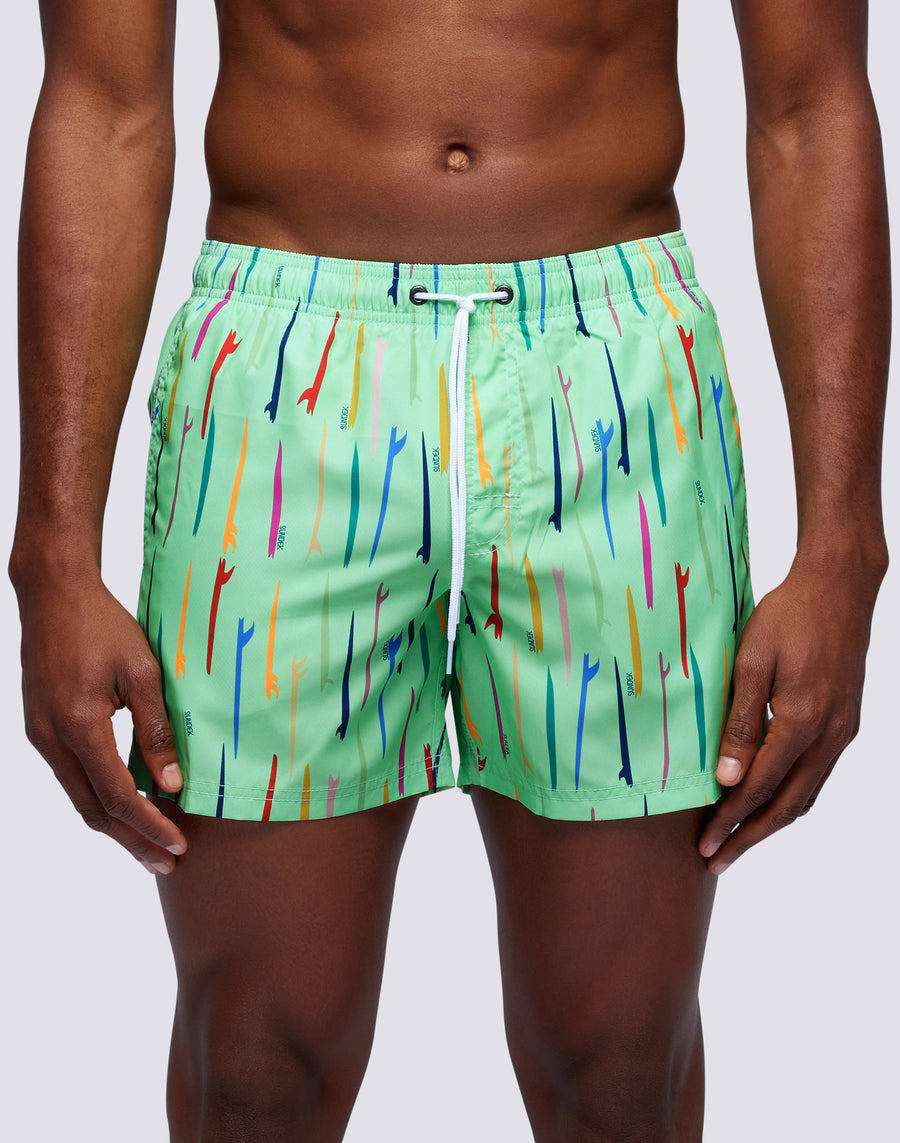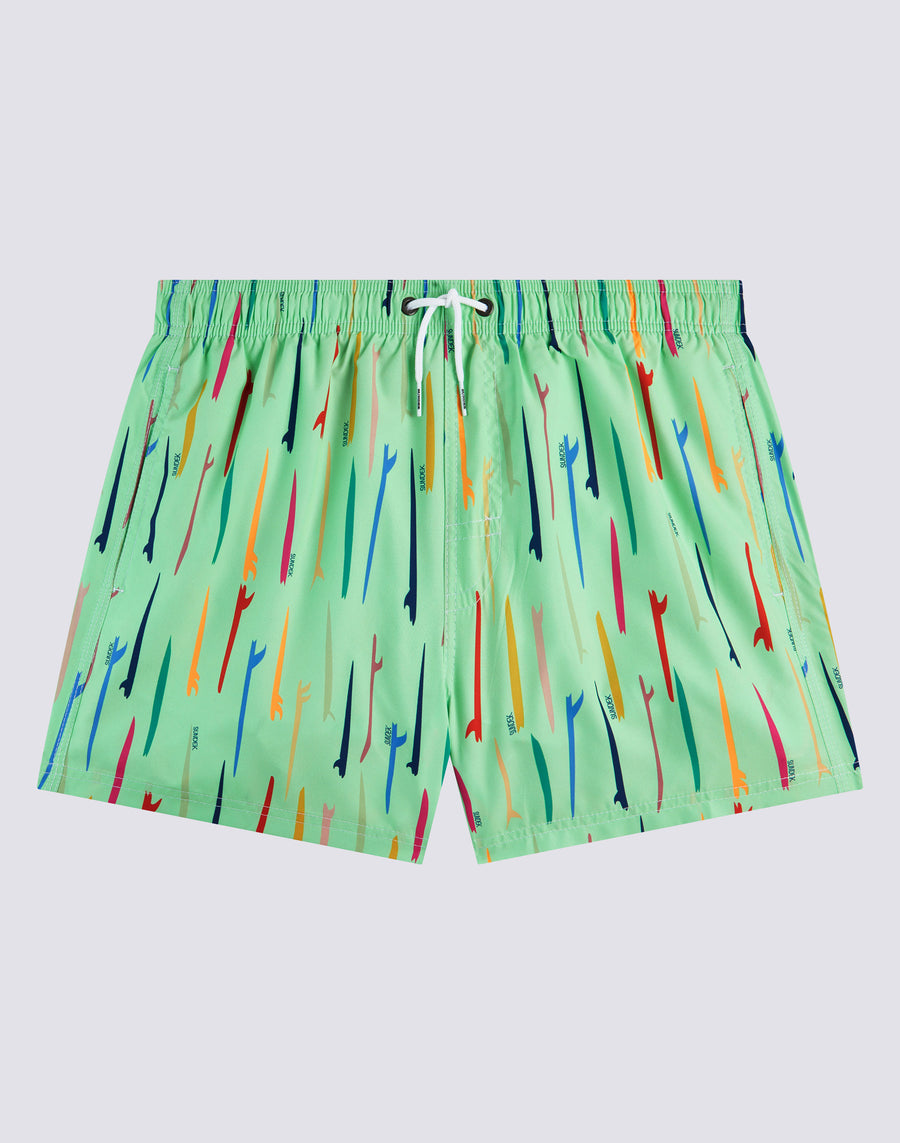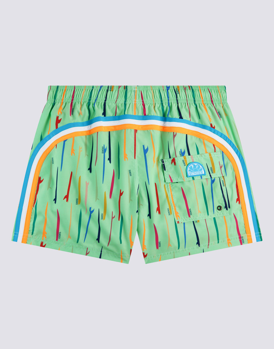 Swim trunks with elasticated drawstring waistband, in lightweight recycled Repreve® fabric made of plastic bottles. Iconic rainbow detail on the back and Pop Surf microprint. Outseam 14"/35 cm (size m).
