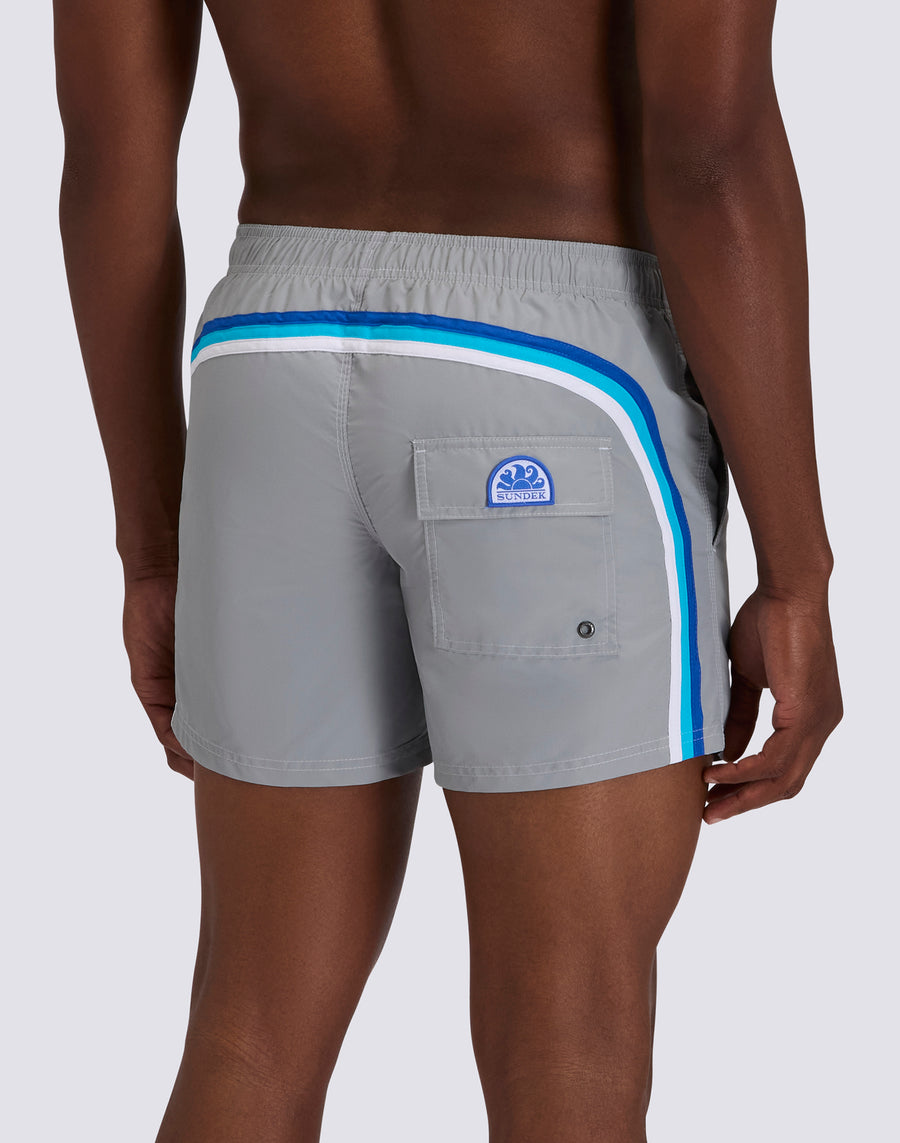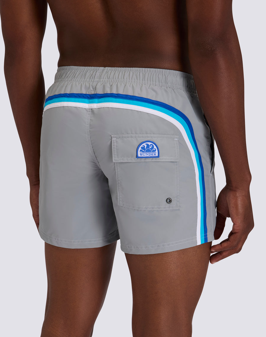 The M504BDTA100 men's short swimsuit embodies the essence of Sundek style: the perfect balance between iconic design, absolute comfort and quality. These elasticated waist beach shorts are the ideal companion for those seeking freedom of movement, quick drying and unmistakable style. Made from 100% nylon taffeta, the fabric that has made Sundek famous since 1958, these swim shorts offer a silky texture, exceptional lightness and extraordinary durability. Ultra-fast drying ensures immediate comfort, both in the waves and out of the water, allowing you to transition effortlessly from the beach to aperitif time. Featuring the unmistakable Sundek rainbow on the back, a symbol of the brand's authenticity and heritage, these swim shorts have an elasticated waist with an adjustable drawstring for a customised fit. The three-needle stitching ensures maximum strength and durability, even after countless sessions of surfing, swimming and sunbathing. Versatile and high-performance, perfect for surfing, swimming, beach volleyball and leisure, these men's swim shorts combine technical performance and casual style. The 35 cm length (in size M) offers a modern and sporty fit, ideal for those who love freedom of movement.