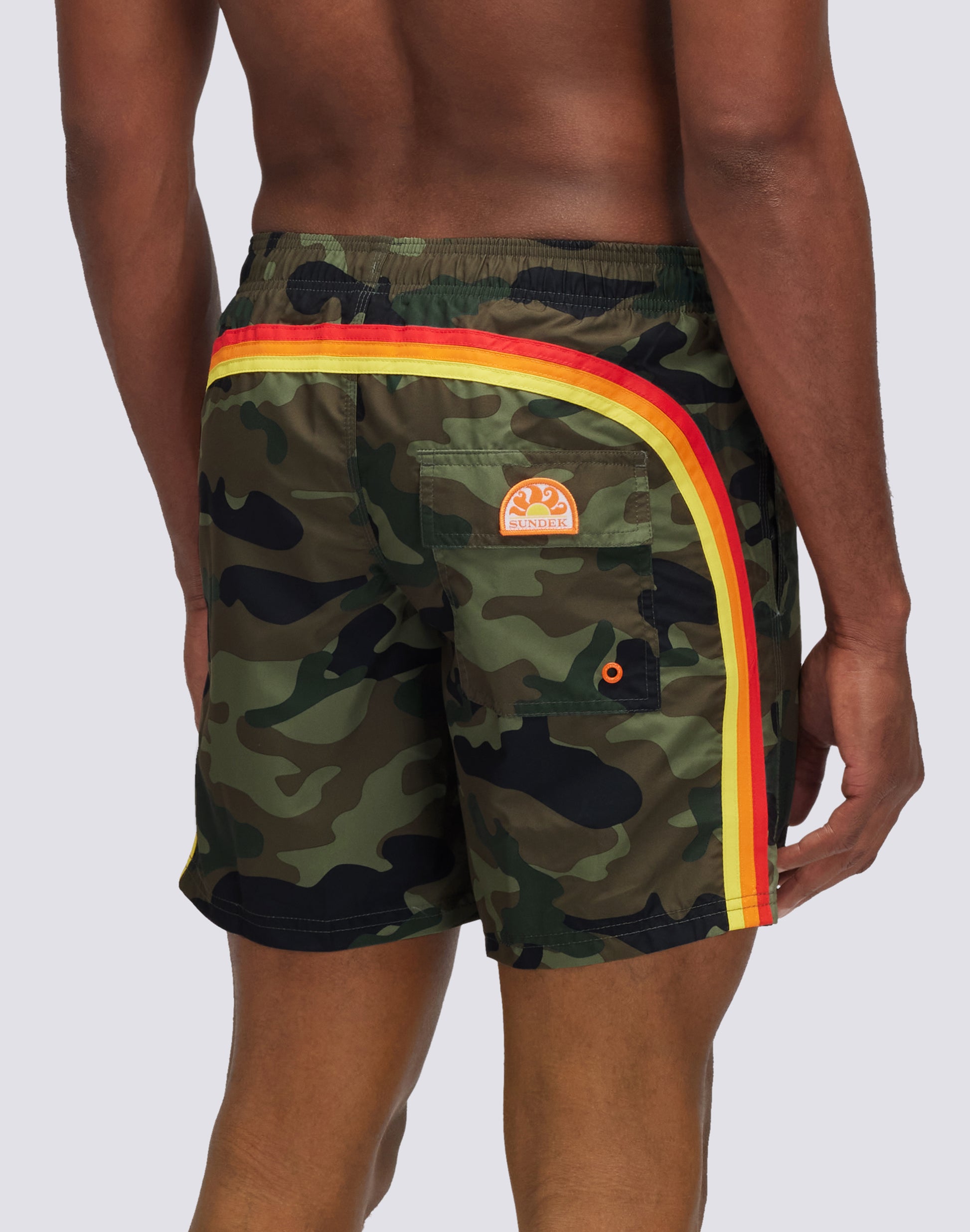 The camouflage print won't let your stretch-waisted Sundek medium swimming costume go unnoticed, comfortable and perfect thanks to the three-needle stitching that makes it super durable. Made of basic micropeach polyester, it features a small pocket on the back and the iconic Sundek rainbow.