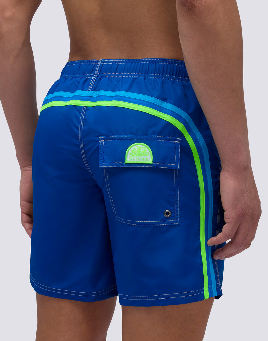 All the timeless Sundek style in this mid-length boardshort with an elasticated waist. Stylish, comfortable, designed to last holiday after holiday: it's our classic boardshort with drawstring waist and contrasting rainbow on the back, made from our historic lightweight and quick-drying nylon taffeta fabric, durable, with three-needle stitching for a further reinforcement. Length 41 cm (size M), measured on the outside of the leg.