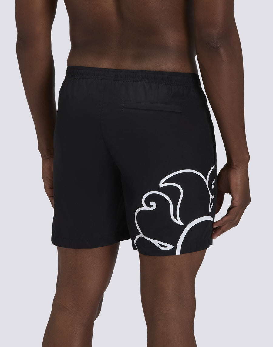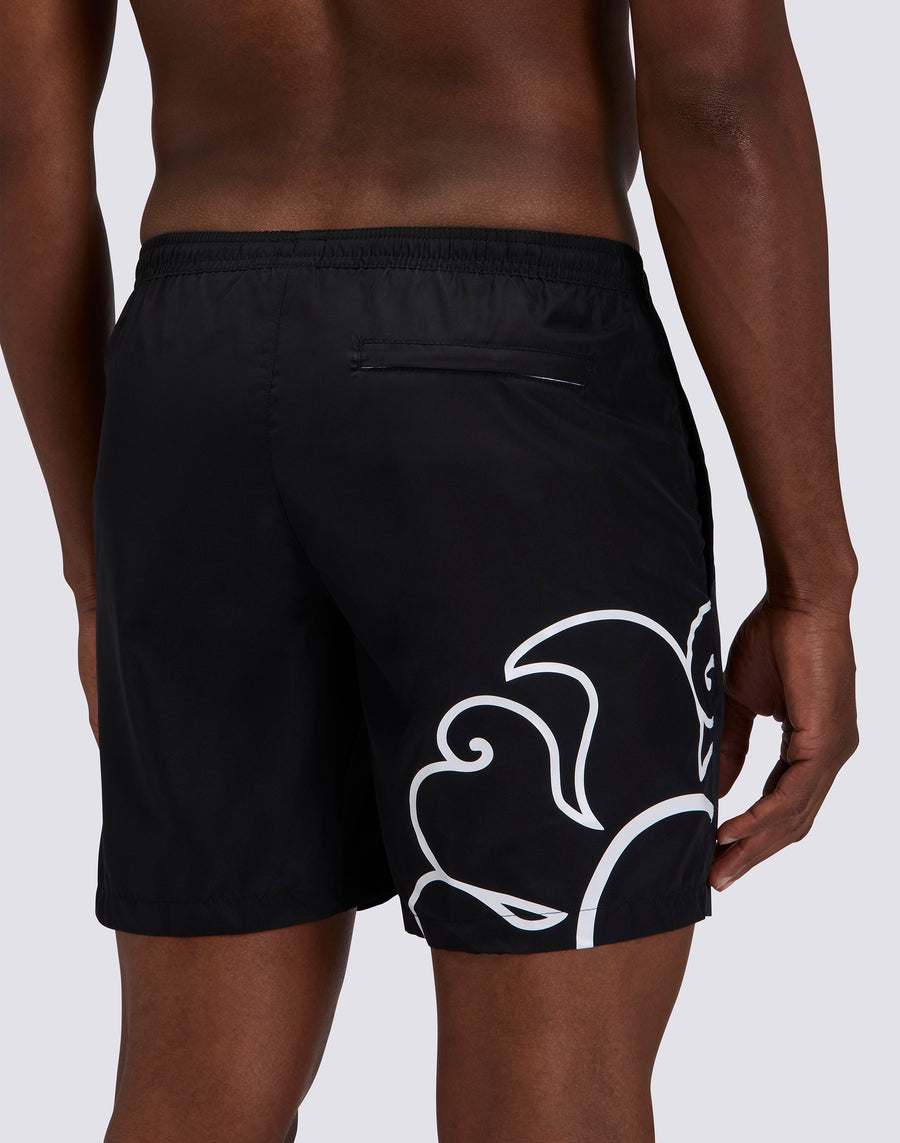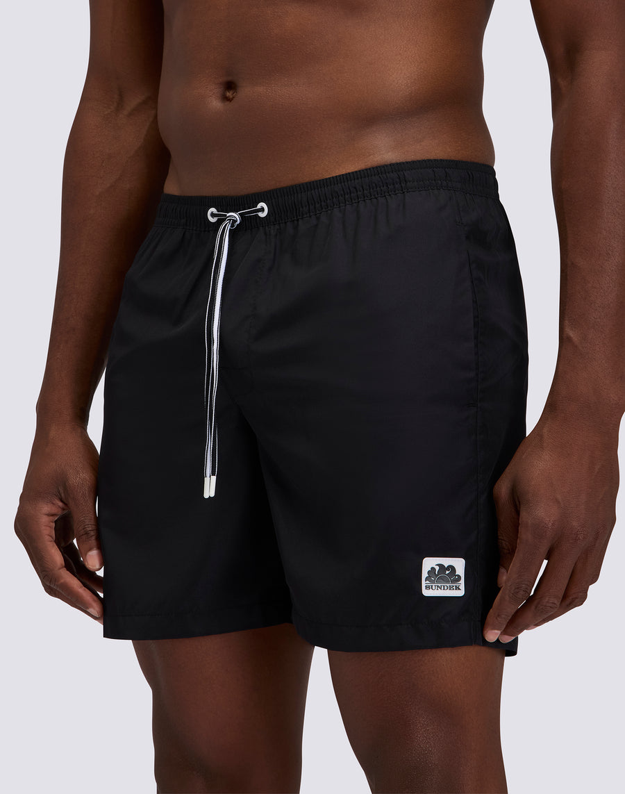 Swim shorts for men, medium length, elasticated waist. Equipped with drawstring and back zip pocket. It dries quickly thanks to the lightweight polyester with which it is made. Outer leg length 16"/41 cm (in size M).