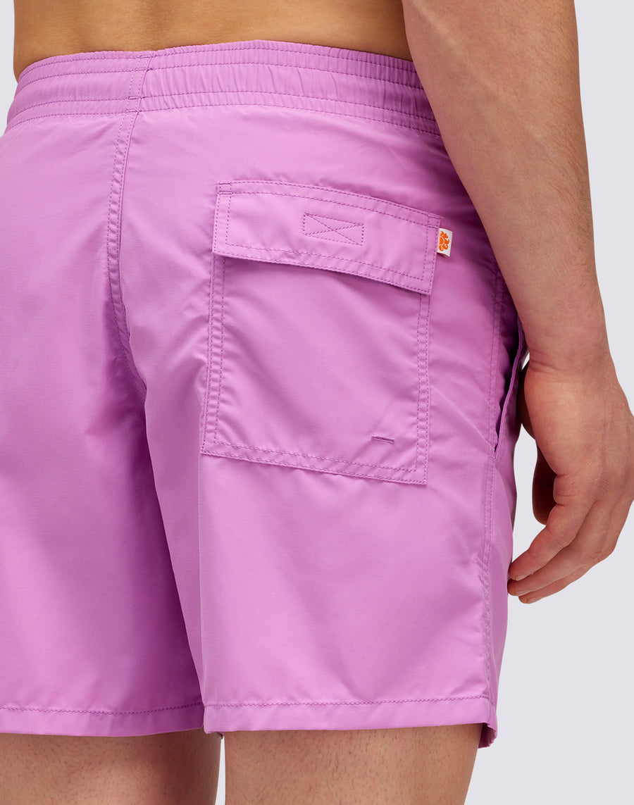 Men's medium-length swimsuit with an elasticated waist. Lightweight, durable, dries quickly and keeps its shape over time thanks to the technical micropeach nylon fabric. It has our classic three-needle stitching for added strength. Outer thigh length 16"/41 cm (in size M).