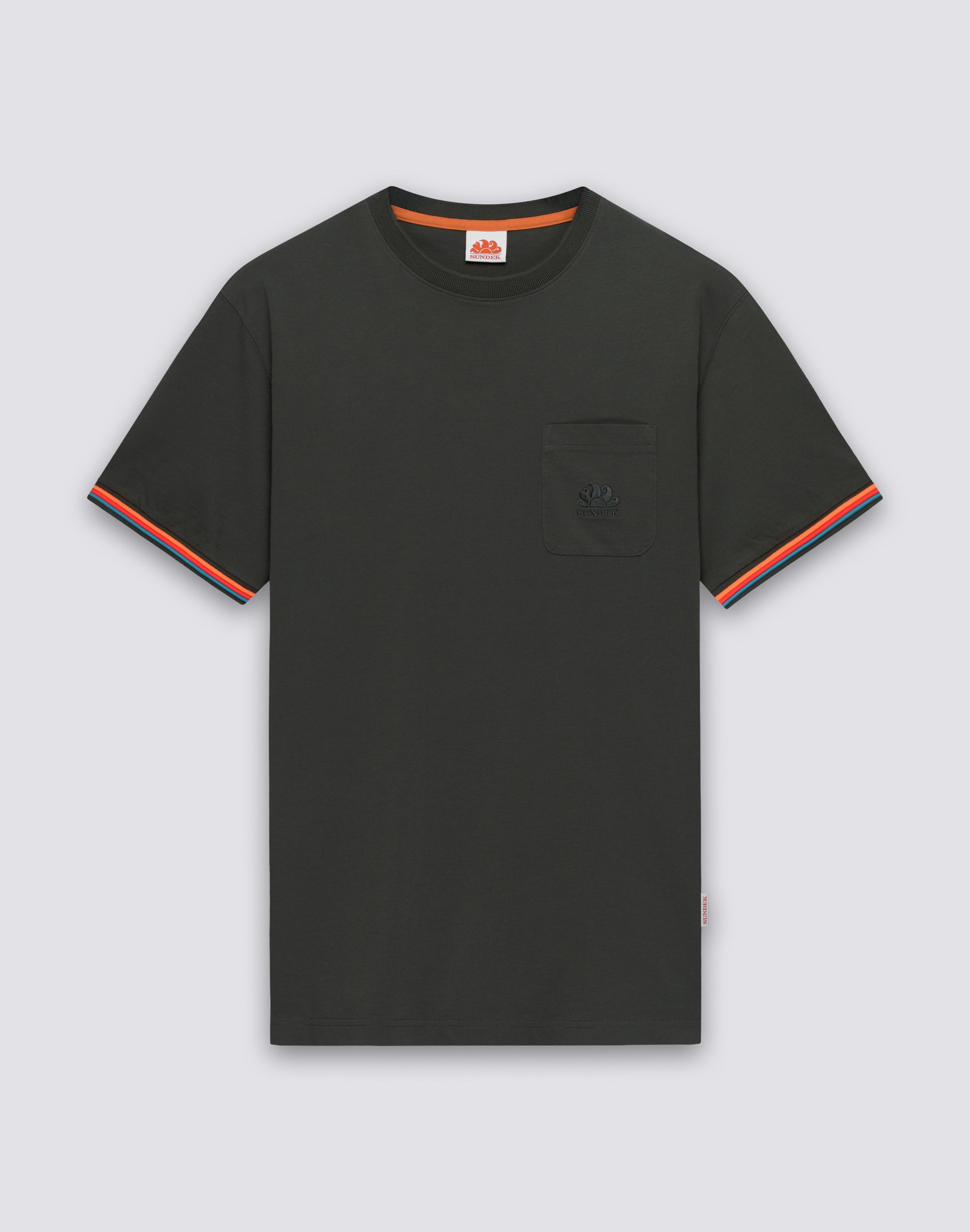 The Finn crew neck T-shirt, in a solid colour with a distinctive tricolour detail at the bottom of the sleeves, is sporty, versatile and perfect for both the beach and the city. The front pocket is perfect for sunglasses, earphones or simply to add structure to the design. It's a minimal detail that makes the T-shirt more interesting and functional. This model has a sporty spirit that makes it ideal both at the beach paired with board shorts, and with jeans for the weekend, with shorts for the summer, and with long trousers for mid-season. The solid colour is the perfect base for simple and effective combinations. The tricolour detail at the bottom of the sleeves adds that touch of character it needs, but the monochromatic base keeps the T-shirt easy to coordinate with anything.
