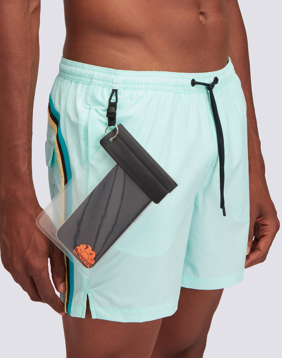 Follow the waves wearing the elastic-waisted men's swimshorts in bright colours. Lightweight, durable, quick-drying and made of 4 Way Stretch fabric. It has a practical removable waterproof pouch, attached to the waist like a key ring; ideal for keeping your mobile phone with you, without having to use pockets or other external bags. It also has Sundek's classic three-needle stitching for added durability and our iconic rainbow on the back.