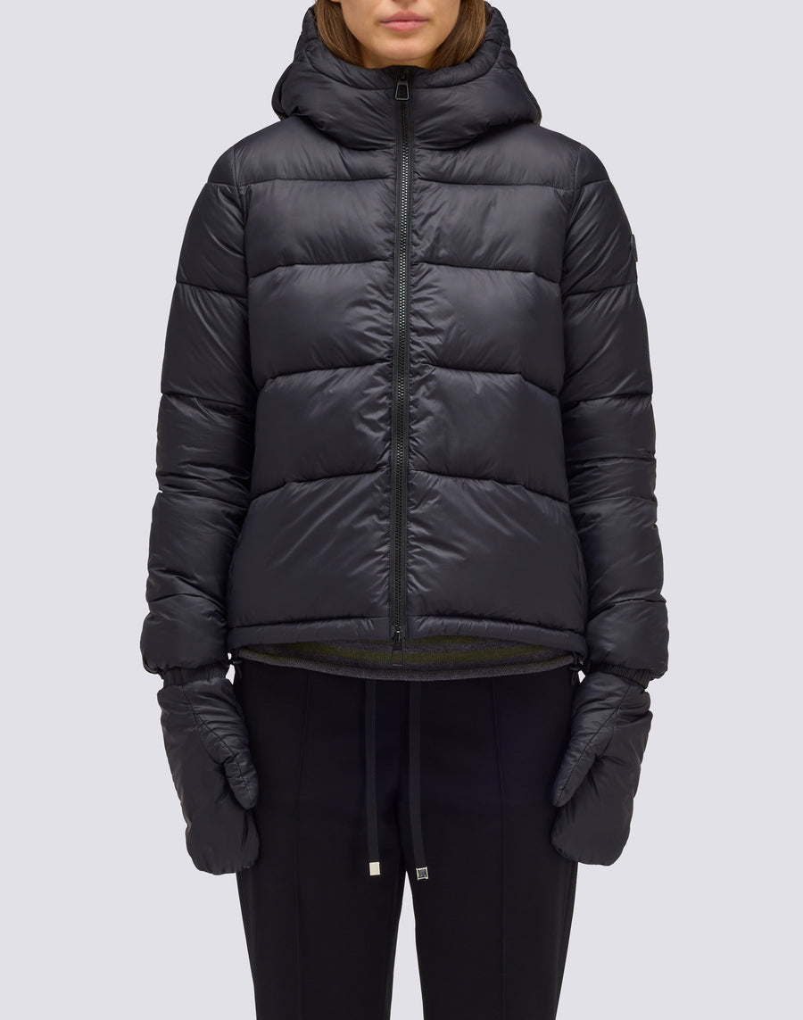 Women's short down jacket with a hood in superlight matte nylon. The jacket is quilted with wide horizontal channels and padded with an innovative Repreve synthetic fiber, which contributes to its lightweight feel while also providing protection from the cold. The down jacket features a color-matched die-cast zipper that closes the front, while the pockets feature invisible zippers. The hood and hem are adjustable with a drawstring and a cord lock. Detachable fleece-lined gloves complete the look. A-line fit for a flattering fit; medium/high warmth rating.