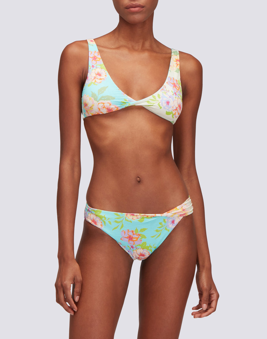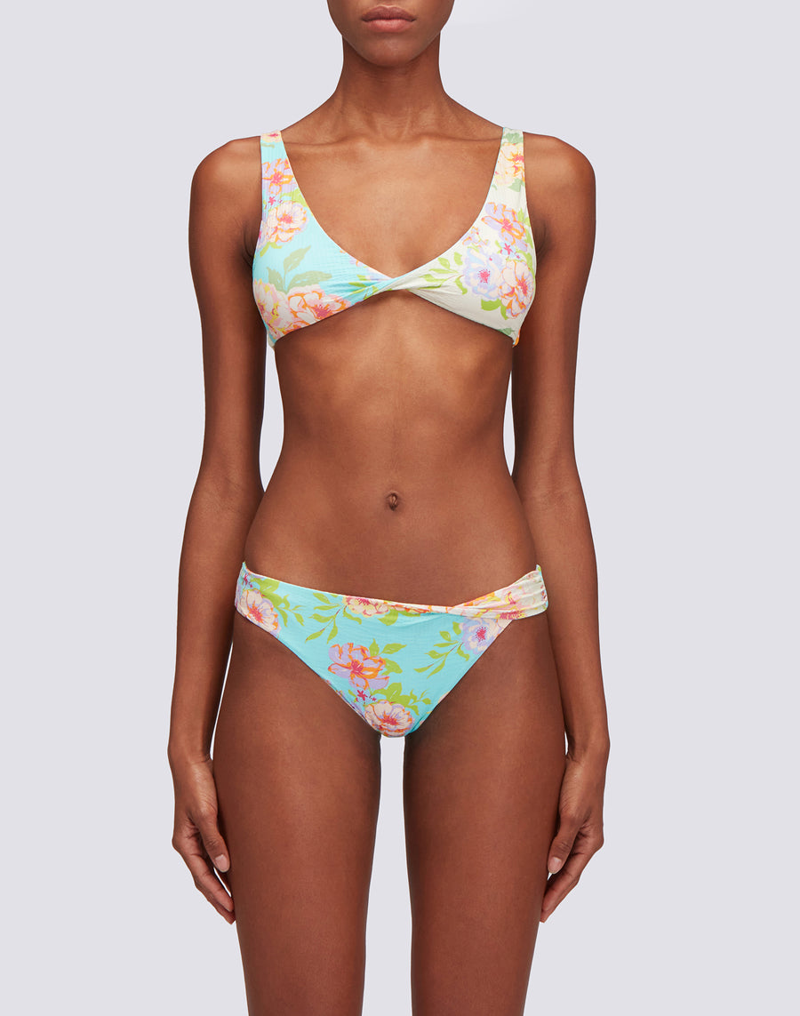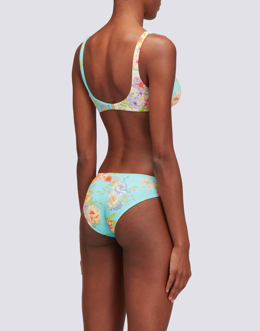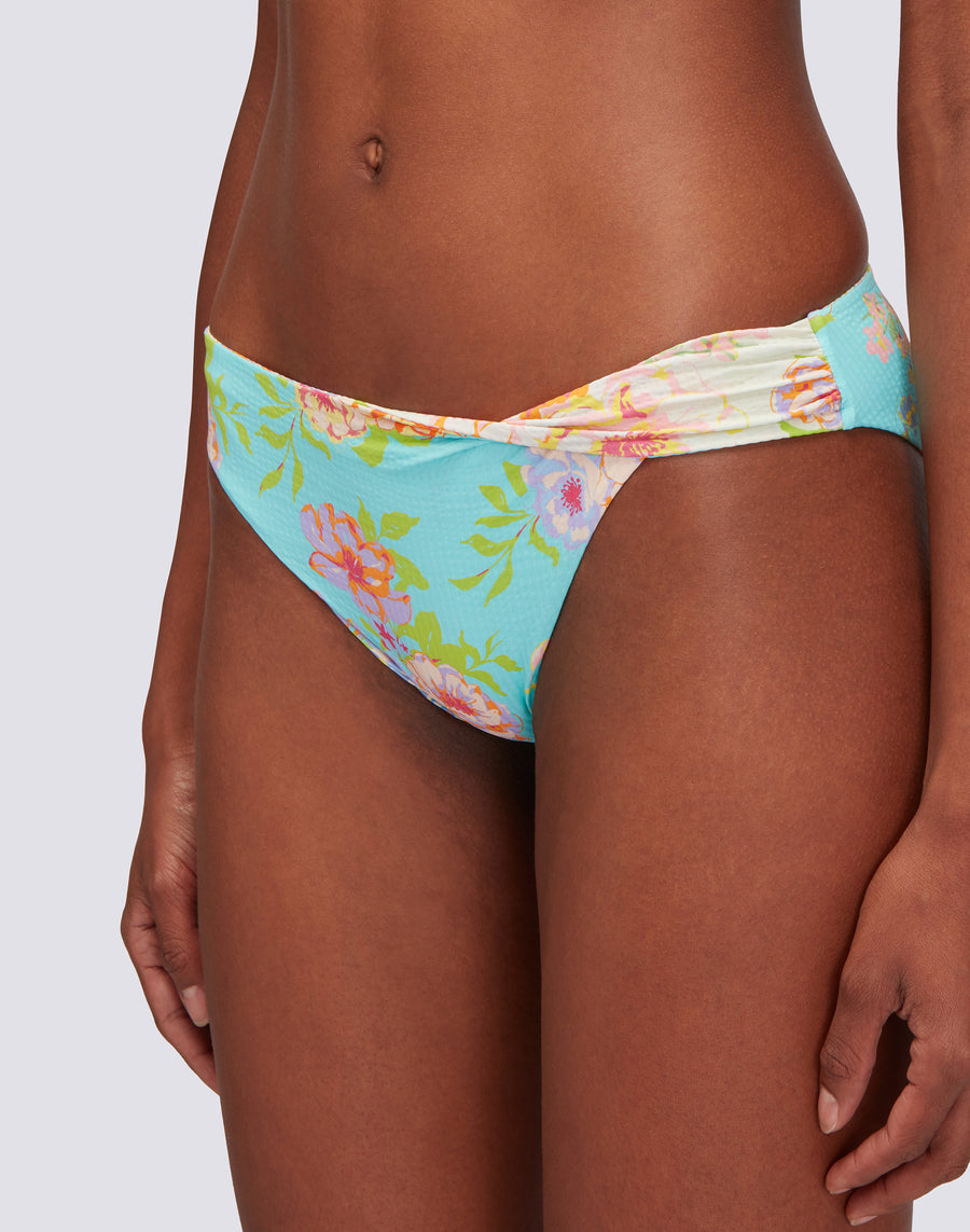For those looking for a bikini with a romantic style, the Zircone fixed-waist brief with crossed hips is perfect. The Flower Bunch print makes it a delicate design and the construction with the criss-crossed hips adds a touch of originality.