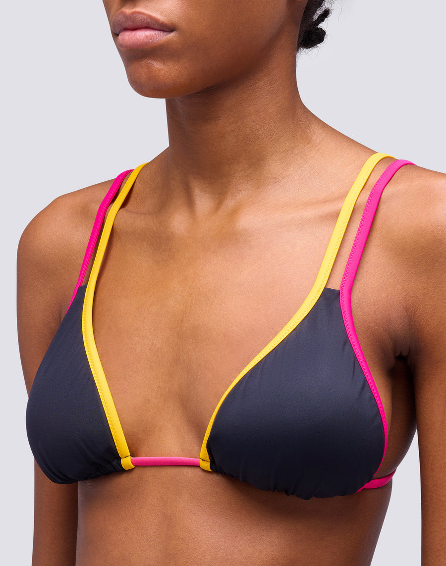 If you love trendy designs, you can count on this beach bikini consisting of a padded triangle top with multi-coloured details and beaded bikini bottoms with tricolour beading at the hips.